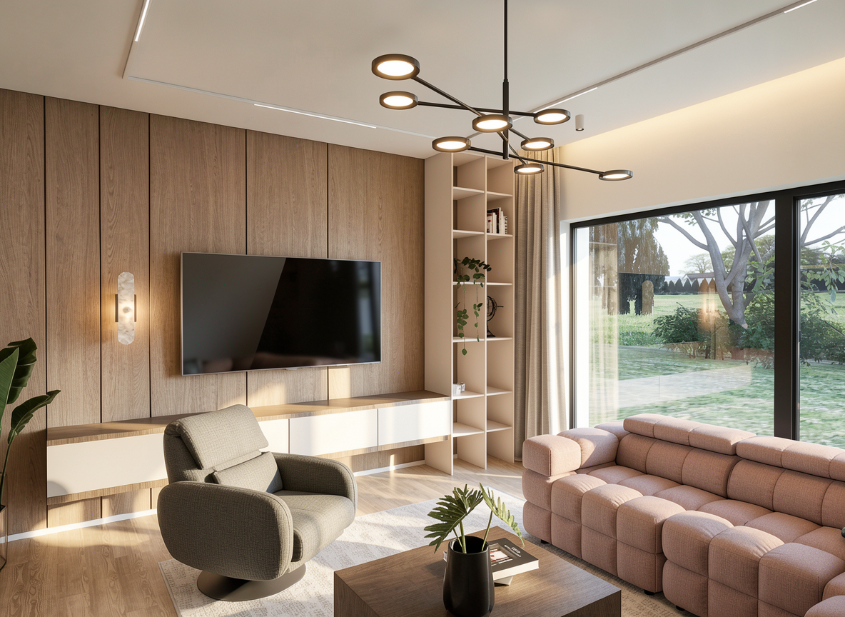 create a realistic render for this interior design bedroom include lighting with it on soft grey beige carpet all over the floor a simple ceiling remove the text soft sheer curtains show the colours of the walls