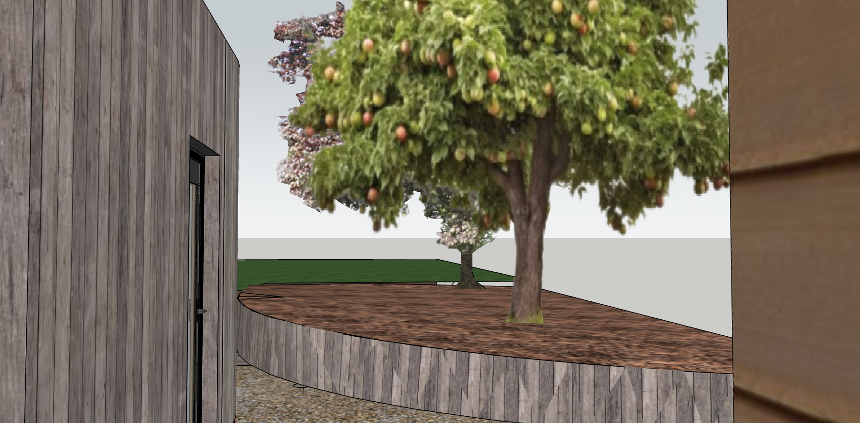 a curving vertical sleeper retainer wall with a bark area beneath a apple and plum tree viewed from between a timber shed on the right and a vertical timber clad house on the left in the distance there is grass up to a distance tree hedgeline