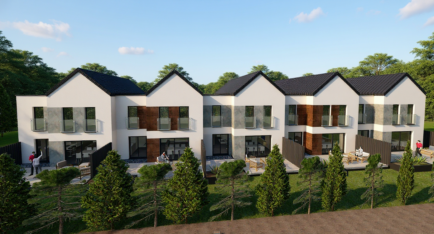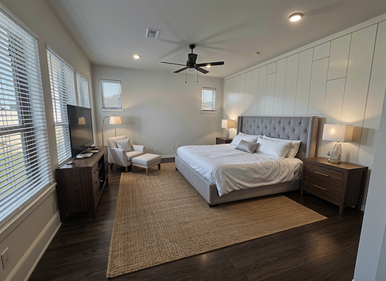 add half of a vertical dark wood slat wall to the back wall add a beige bed and paint the back wall beige and add a bench at the foot of the bed