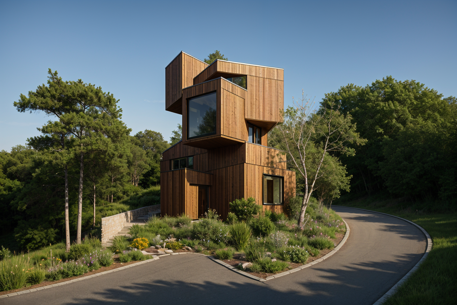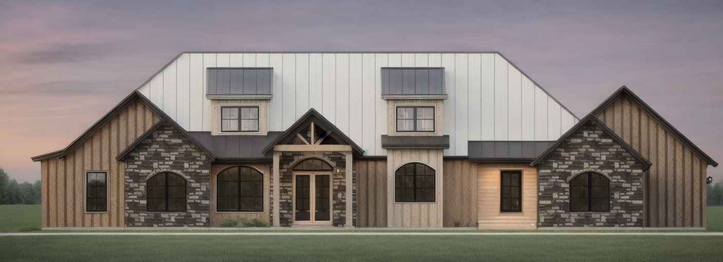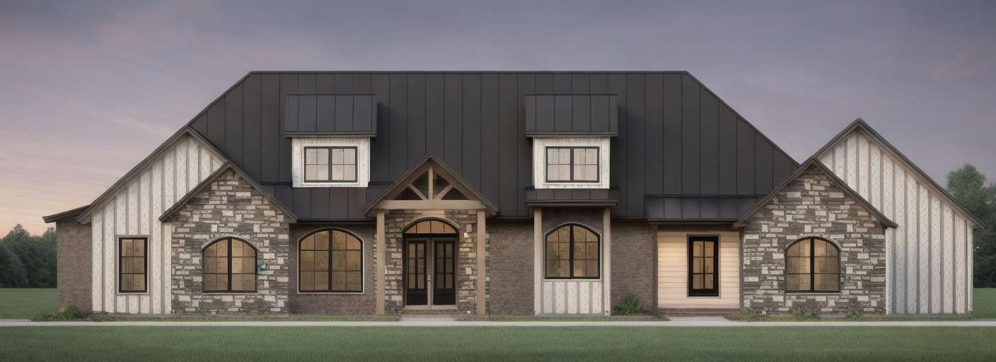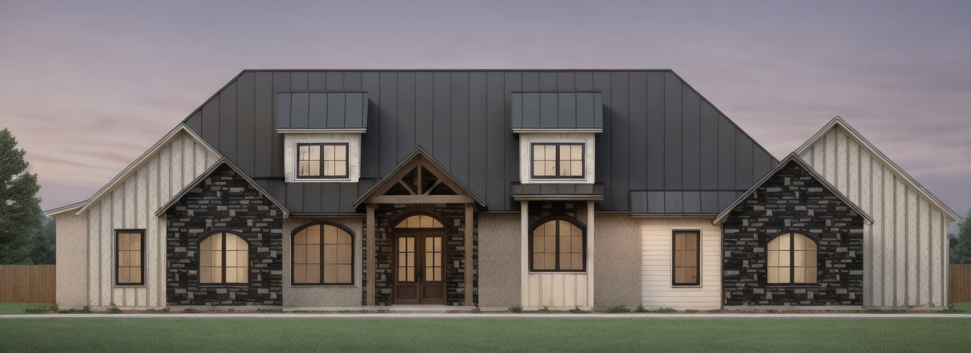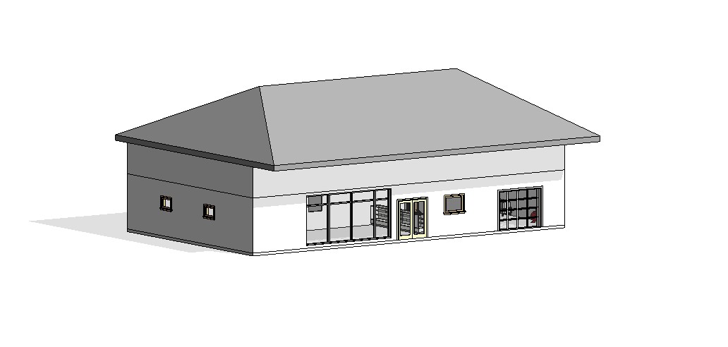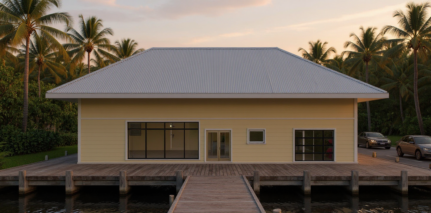 looking directly at the building from the perspective of standing on a dock looking directly at the building behind the building is a parking lot with tropical foliage beyond the parking lot the building is very pale yellow with white trim the trim around all the windows are also white the roof is light color metal the sun is setting in the distance the roof has an 8 foot overhang across the front only all of the window trim is white