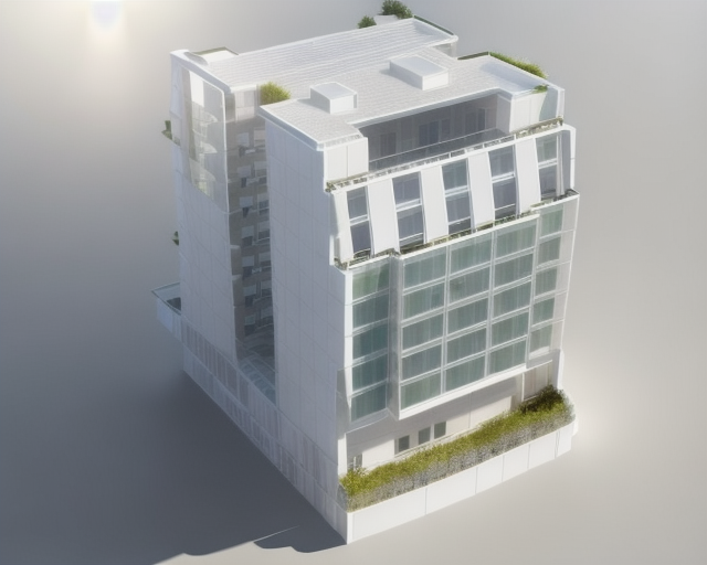 exterior shot render a modern multi story building featuring sleek glass windows and a structured facade that uses limestone cladding in lightgrey beige tones
