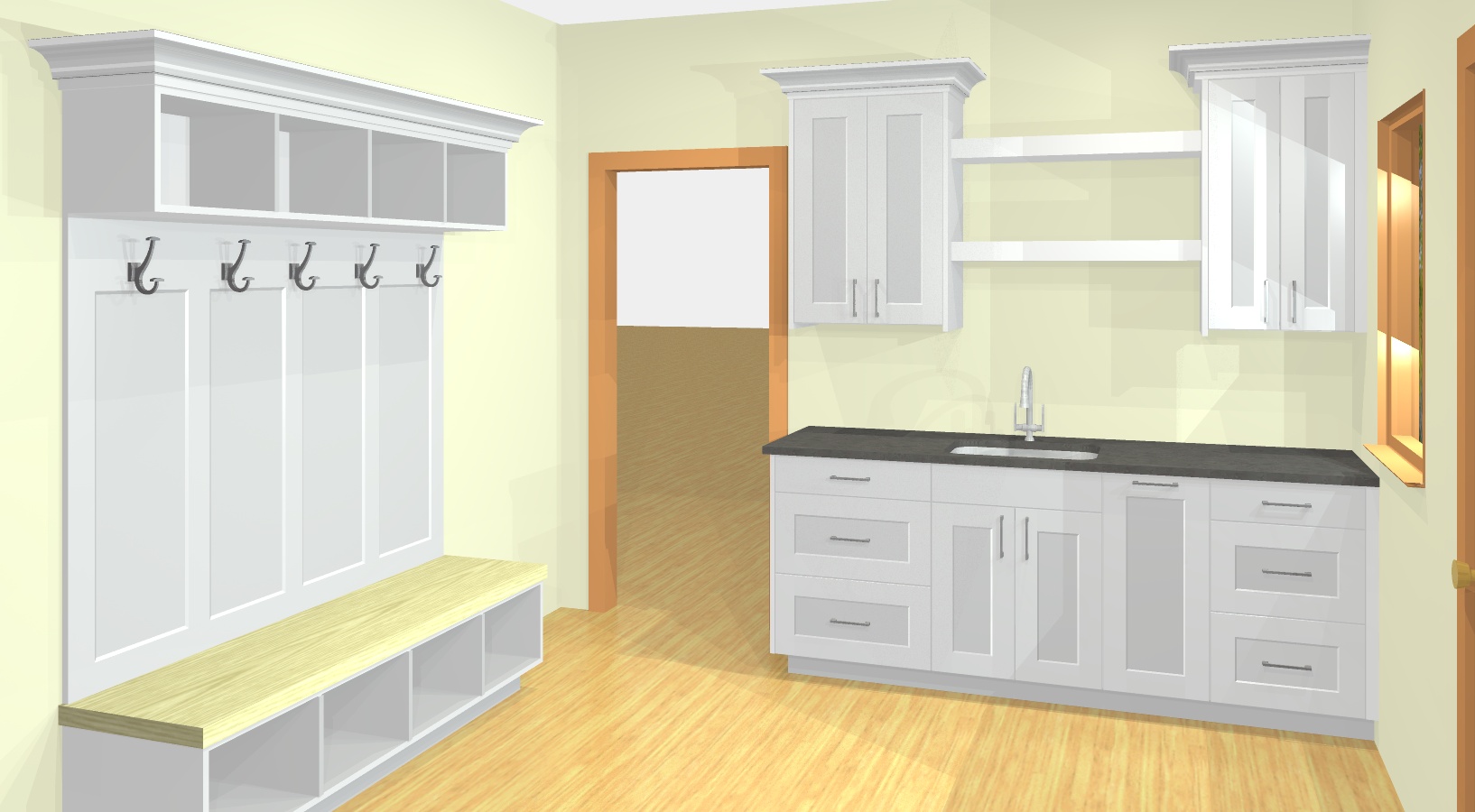 sage green cabinetry with white granite countertop place wicker baskets in cubbies on the bench wall and a couple coats hanging on the hooks
