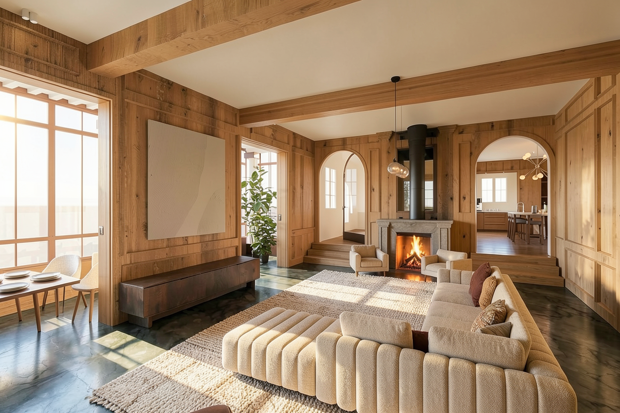 the couch more beige and nice clear wood on the surrounding walls plates on the table on the left rug texture a fire in the chimney with the arched mirror on top