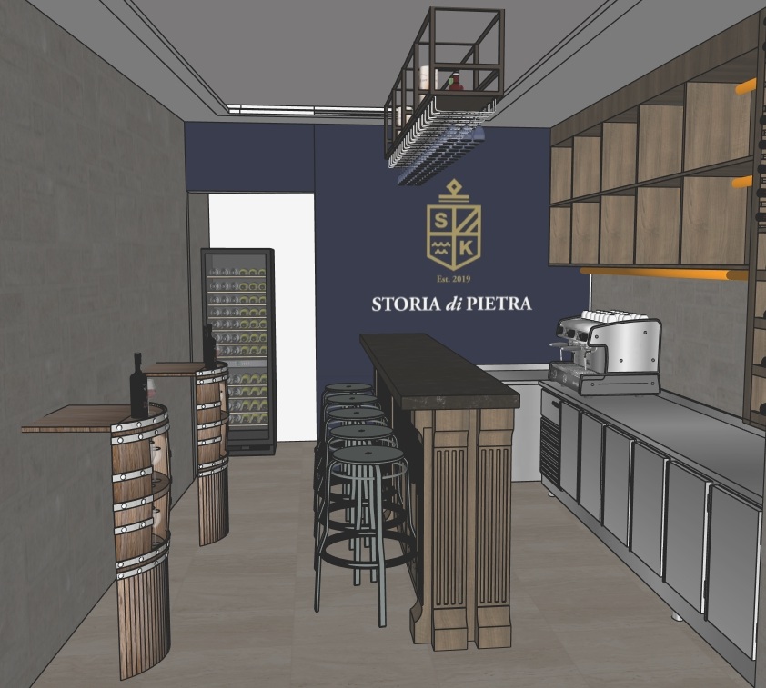 modern winery interior with mediterranean style natural mediterranean stone walls authentic raw texture not artificial elegant and balanced layout warm and inviting atmosphere wooden wine racks filled with bottles central tasting table made of natural oak wood integrated led lighting with warm white tone not yellow soft and clean illumination led strips placed behind wine bottles to create subtle backlighting effect hidden led lighting along shelves ceiling lines and floor edges consistent color palette beige sand soft brown muted gold tones combination of natural stone and wood materials luxurious yet rustic design minimalistic but cozy soft shadows cinematic lighting ultra realistic render 8k architectural visualization depth and perspective intimate and welcoming mood add people