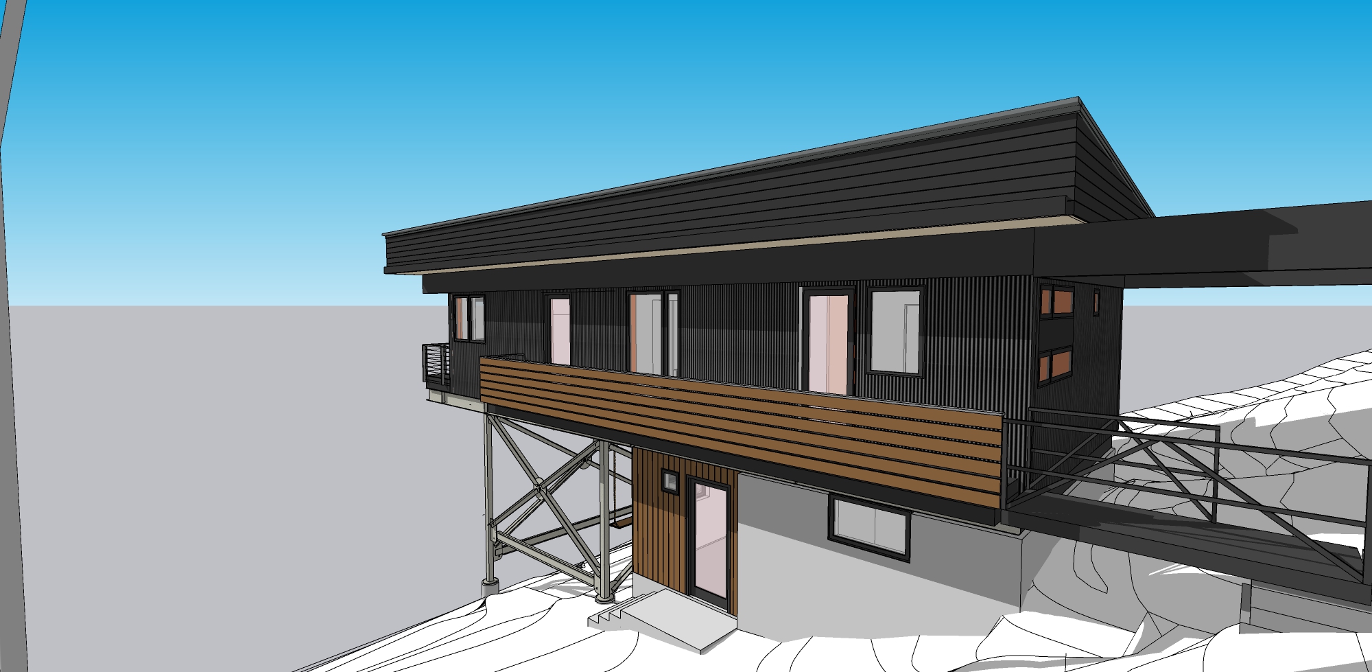 a black house on galvanised steel and concrete foundation sitting on shale cliff overlooking a very wide lake with a few hemlock trees around