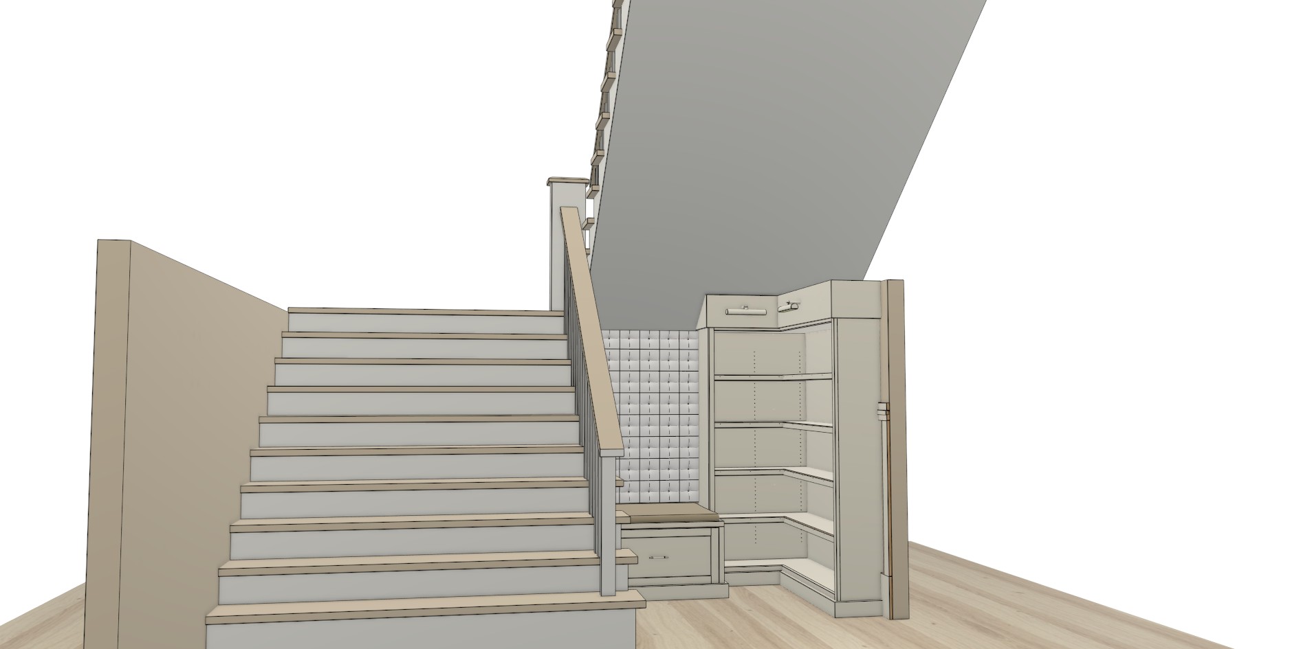 this is an l shelf bookshelf built under a stair case there is padded seating area with a padded wall on the left