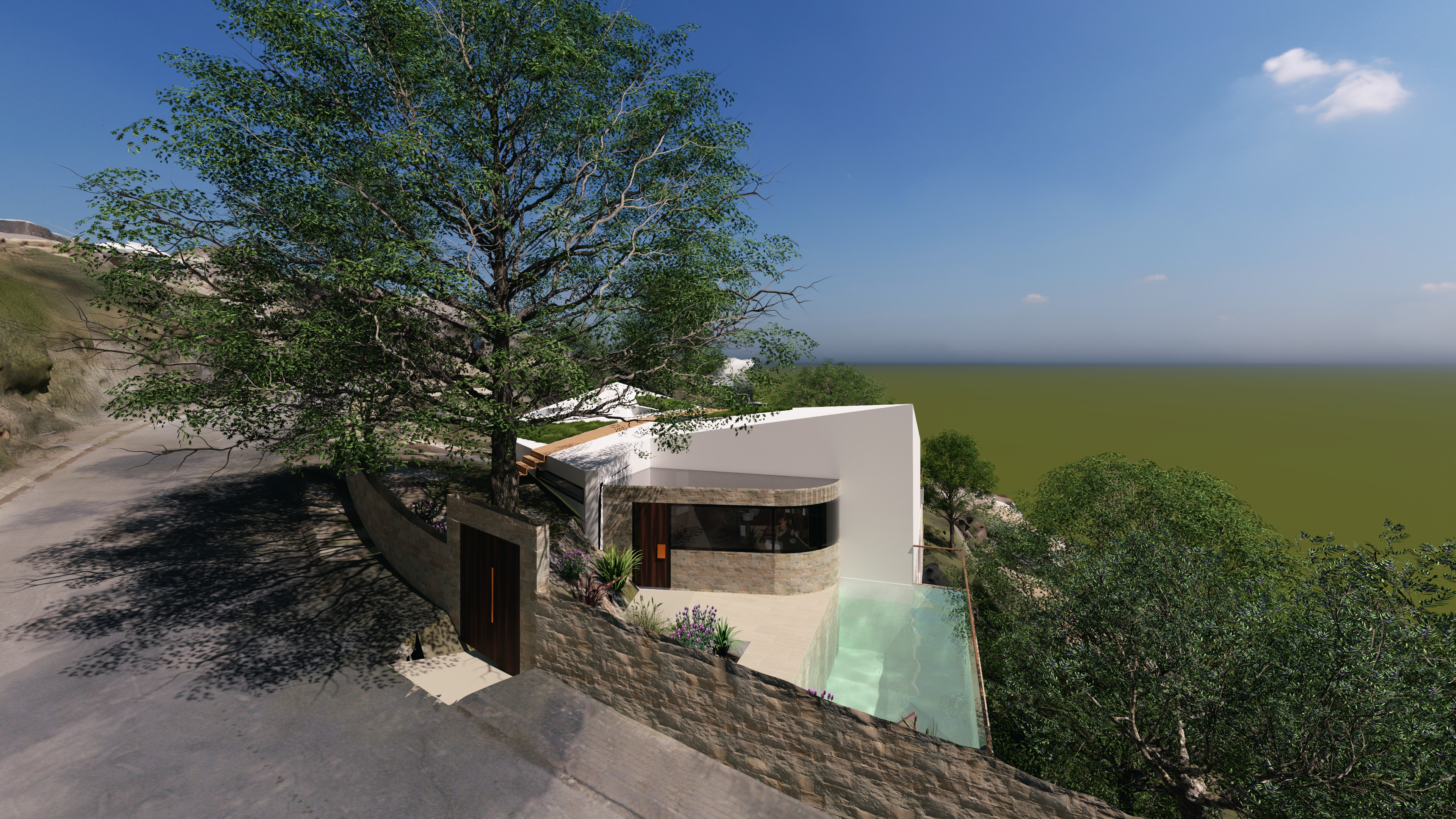 necesito que mejores esta imagen sin modificar el volumen original de la vivienda necesito que mejores las puertas de las entradas para que parezcan de una vivienda estilo altea hills luxury que el acabado de la fachada del volumen m s grande sea monocapa blanco y el acabado de la fachada del volumen m s peque o de la entrada sea de piedra vista al igual que el muro perimetral de parcela el borde de la piscina podr a ser estilo baldosa de pavimento travertino el borde del vallado por el exterior de la parcela es una acera p blica y una carretera el volumen de la piscina tampoco se puede modificar