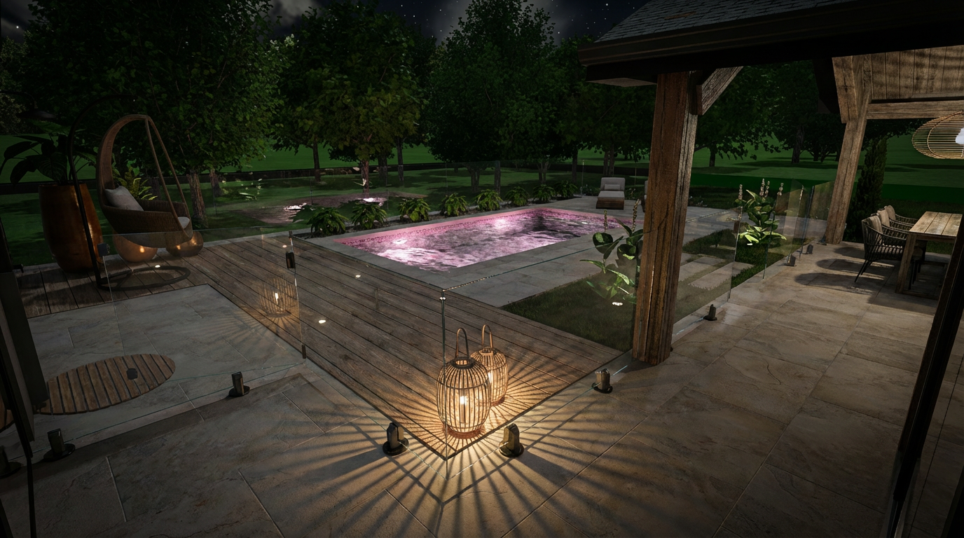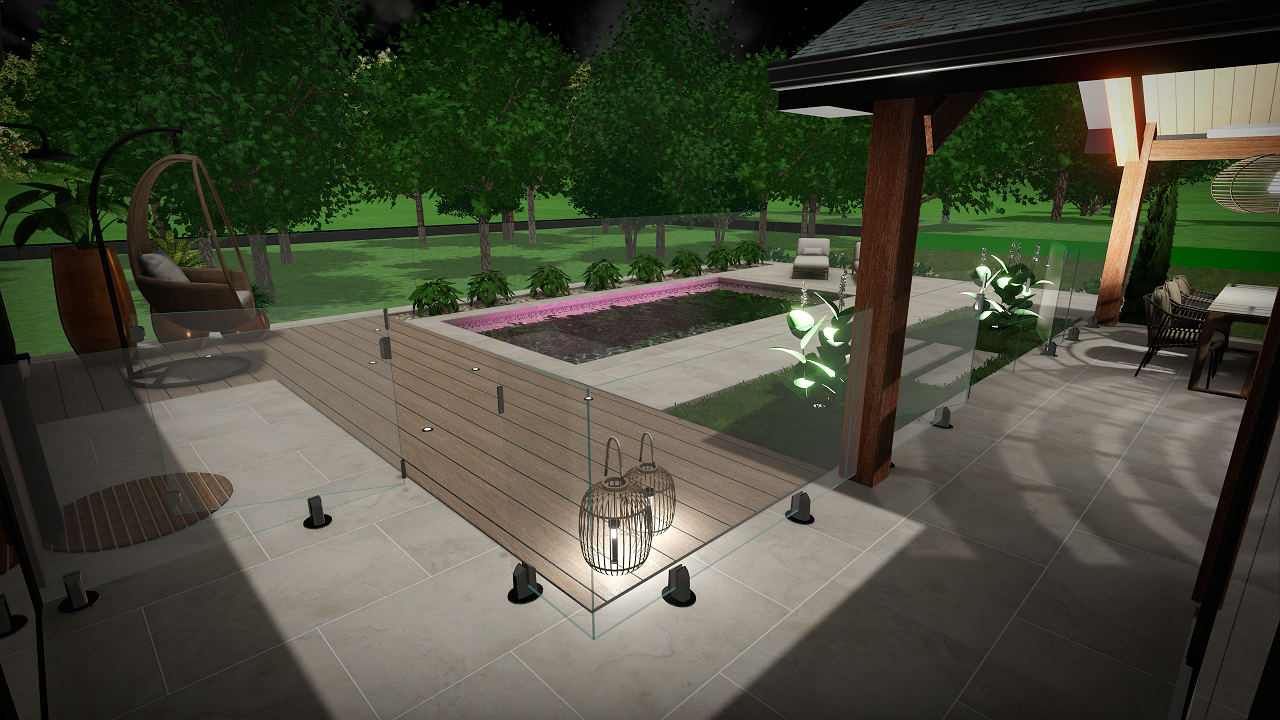 create a serene nighttime garden scene featuring a wooden deck with soft warm lighting highlight a modern glass railing with subtle reflections render a rectangular swimming pool with a gentle pink glow surround the scene with lush dark green trees and glowing white flowers include a cozy seating area with a dark wicker chair on the porch and an inviting outdoor dining space under a roof supported by rich brown wooden beams use light gray tiles on the floor and an overall tranquil ambiance under a starlit sky