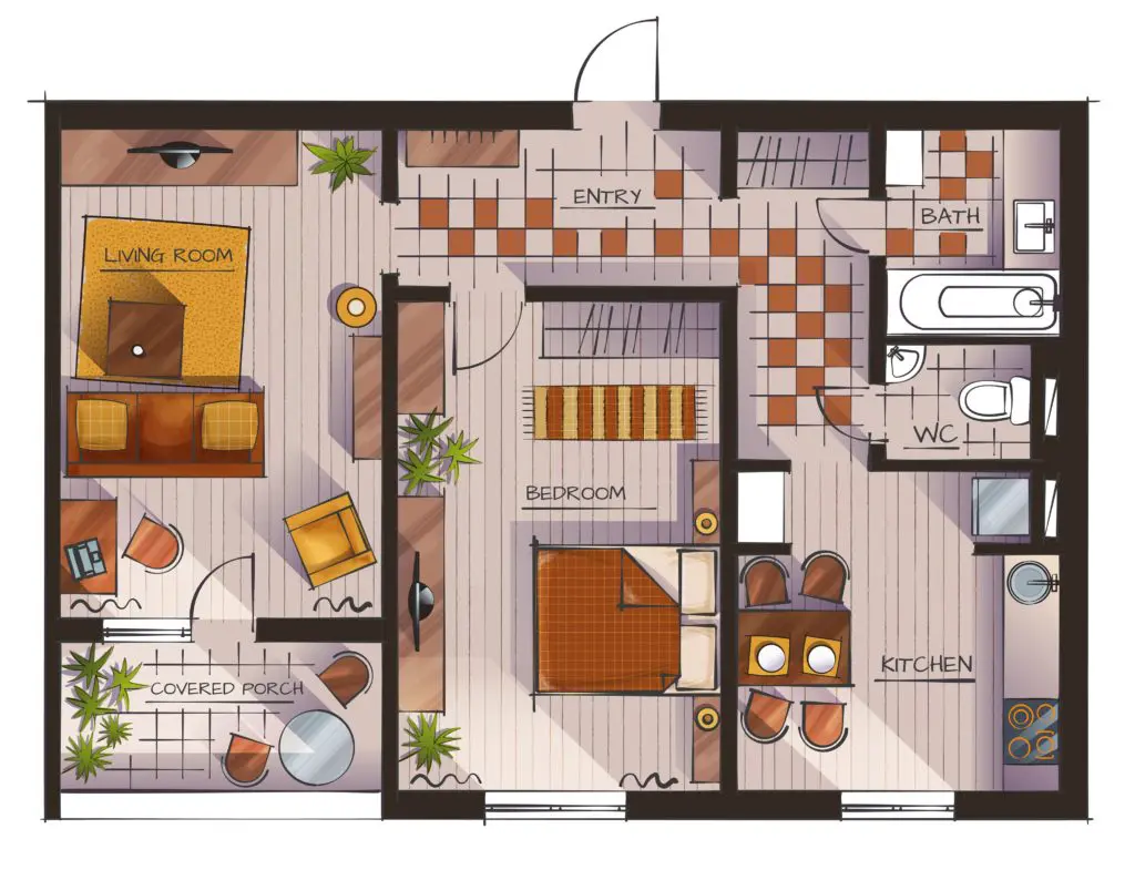a cozy and inviting apartment floor plan with a warm and harmonious color scheme the living room features a soft cream sofa with accent pillows in shades of burnt orange and mustard yellow the wooden coffee table and side tables are rich mahogany add a subtle beige area rug for a plush feel underfoot the covered porch is decorated with fresh green potted plants and minimalist furniture in terracotta tones emphasizing natural tranquility the entryway showcases a warm oak console table with delicate brass accents in the kitchen modern cabinets are painted a soft dove gray complementing the sandy colored countertops the bathroom is styled with serene white tiles and soft pastel blue accents wood floors throughout the space are a natural walnut creating a seamless flow the overall atmosphere is serene and inviting with gentle natural light streaming in to enhance the space s warmth and comfort