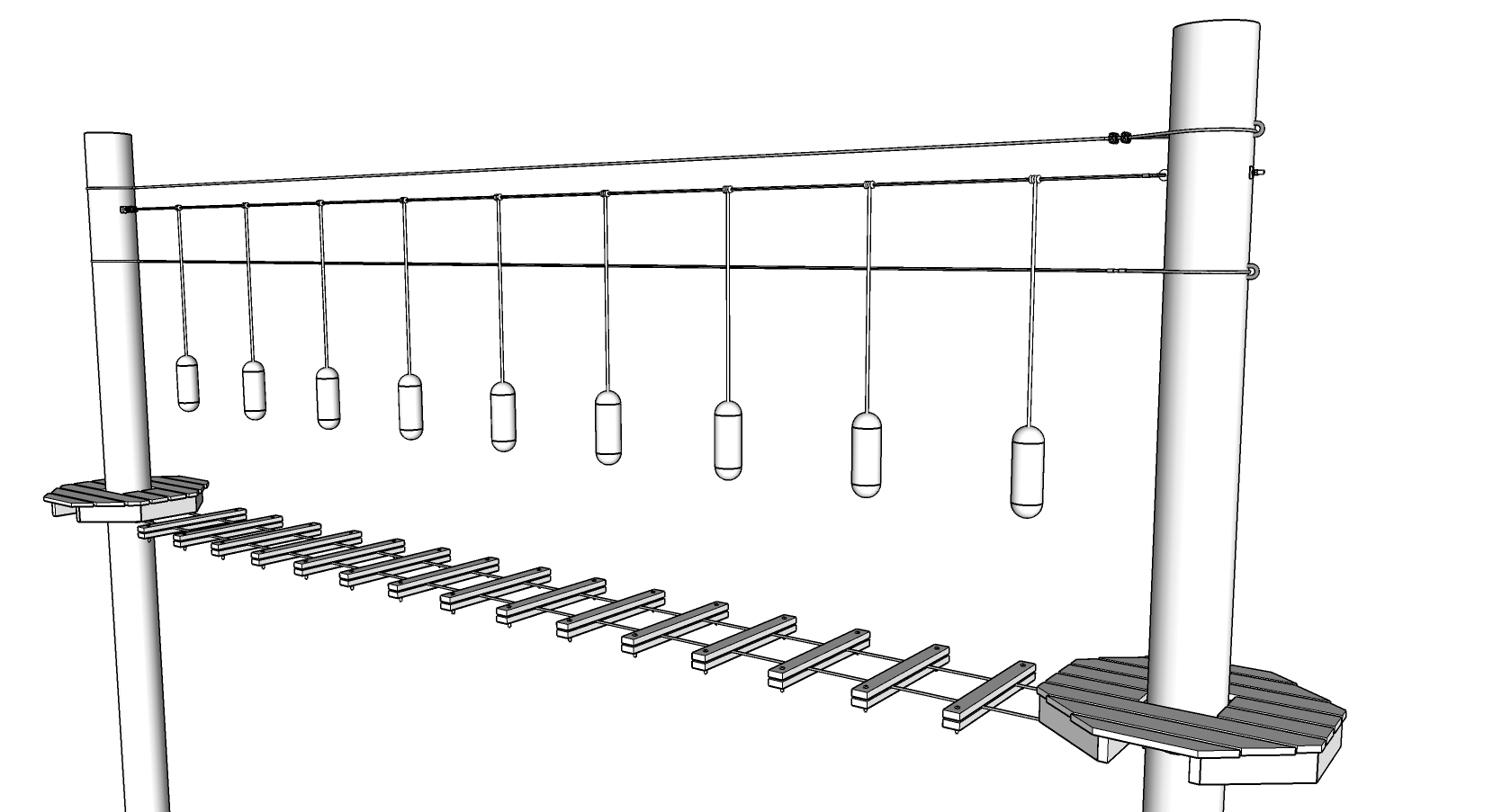 sustainable design exterior shot high ropes obstacle course element with natural brown wood poles wood steps wood platforms and red plastic buoys hanging from rope in an outdoor setting architecture