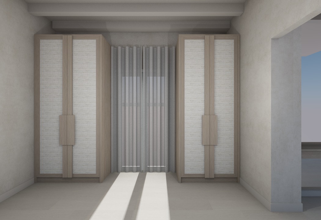 create a highly realistic render of an interior bedroom with a calm and serene atmosphere ultra realistic render high resolution professional interior design photography style keep the design exactly as it is the walls are light beige cemento effect keep exatly the same texture in the wardropes white curtains