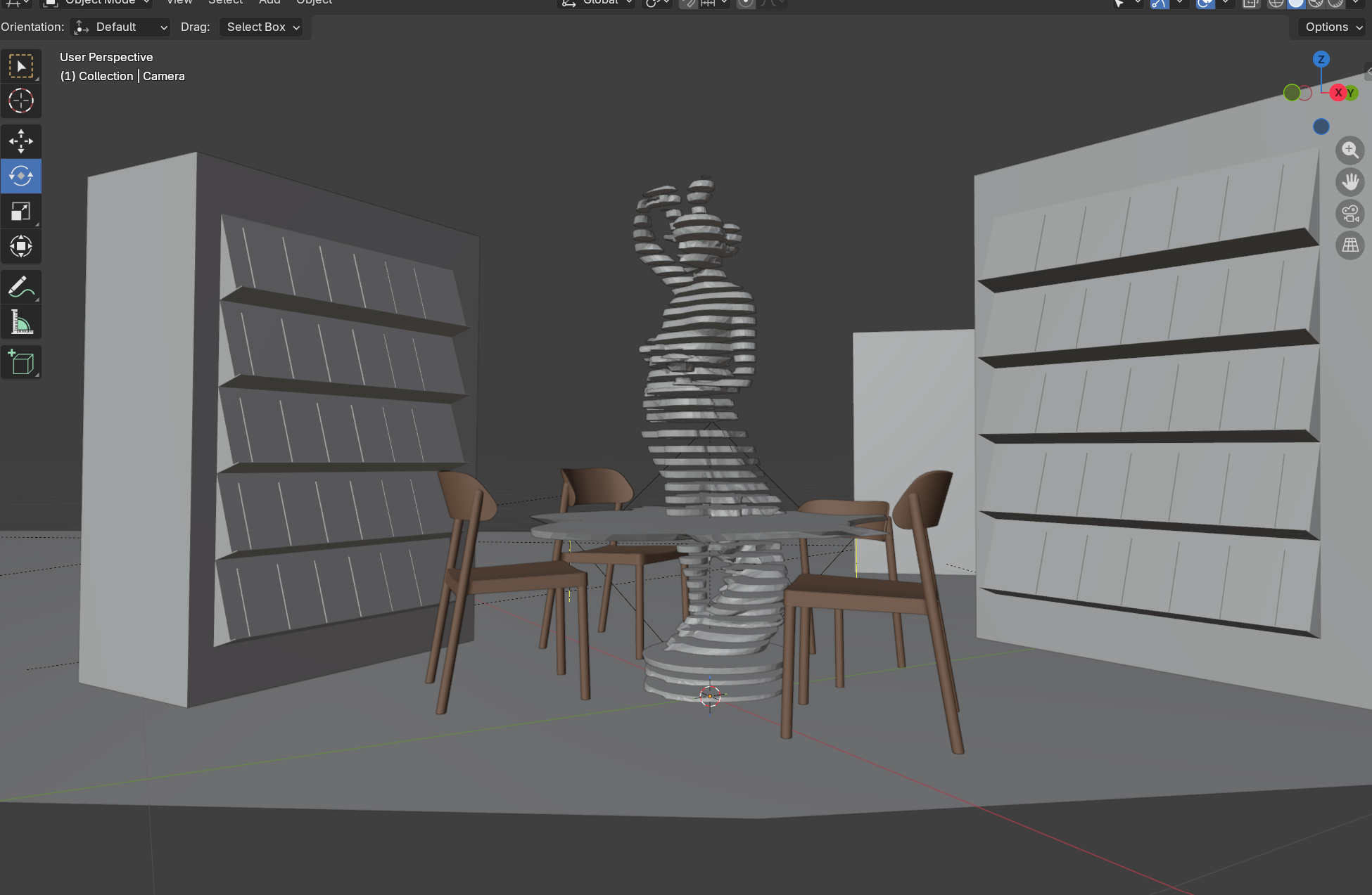 this is an image of a book trade fair booth the visual is meant to have a solid black background the floor plane is italian red carpet the book shelves to the left and right area satin white the books should be in subtle variations of gray the layered sculpture integrated with the table should be italian green the chairs also in the background there is a realistic green wall add soft lighting as in a library reading room