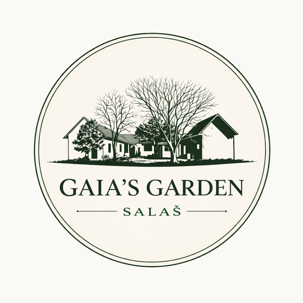 create a refined elegant line art logo for a countryside venue called gaia s garden sala style inspired by premium winery branding like european vineyard estates thin precise line drawing architectural illustration style composition centered building illustration traditional farmhouse complex clean horizontal layout no circle no badge text below the illustration gaia s garden large serif sala smaller spaced letters building illustration simple but refined linework visible roof geometry minimal windows and doors indicated no shading no fills no heavy black masses tree subtle simplified secondary element color deep forest green or dark wine red off white background mood luxury rural retreat winery estate branding timeless elegant premium avoid thick lines cartoon style detailed shading badge or circular logo
