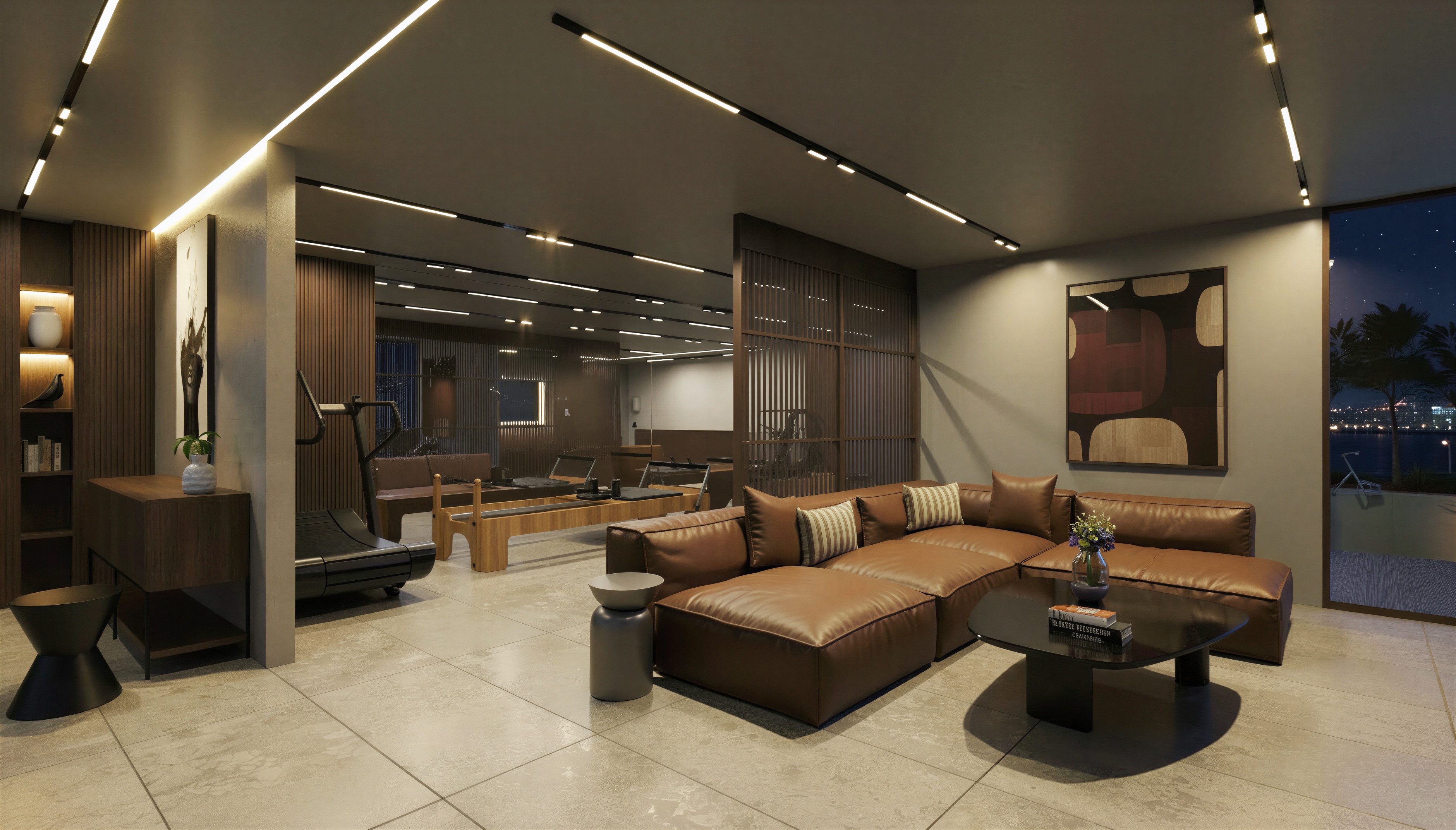 a hyper realist image of a media room interior in a villa basement the sofa has a soft brown fabric