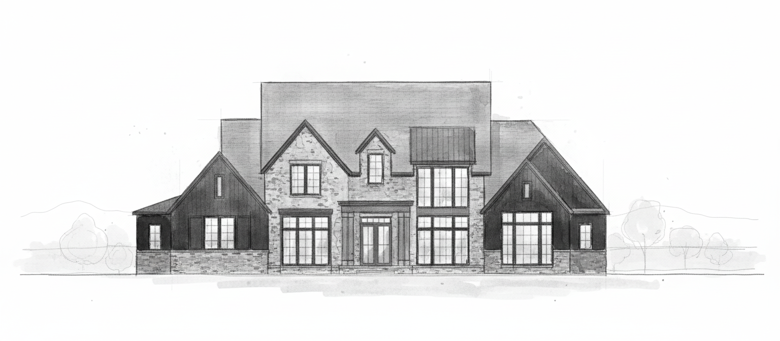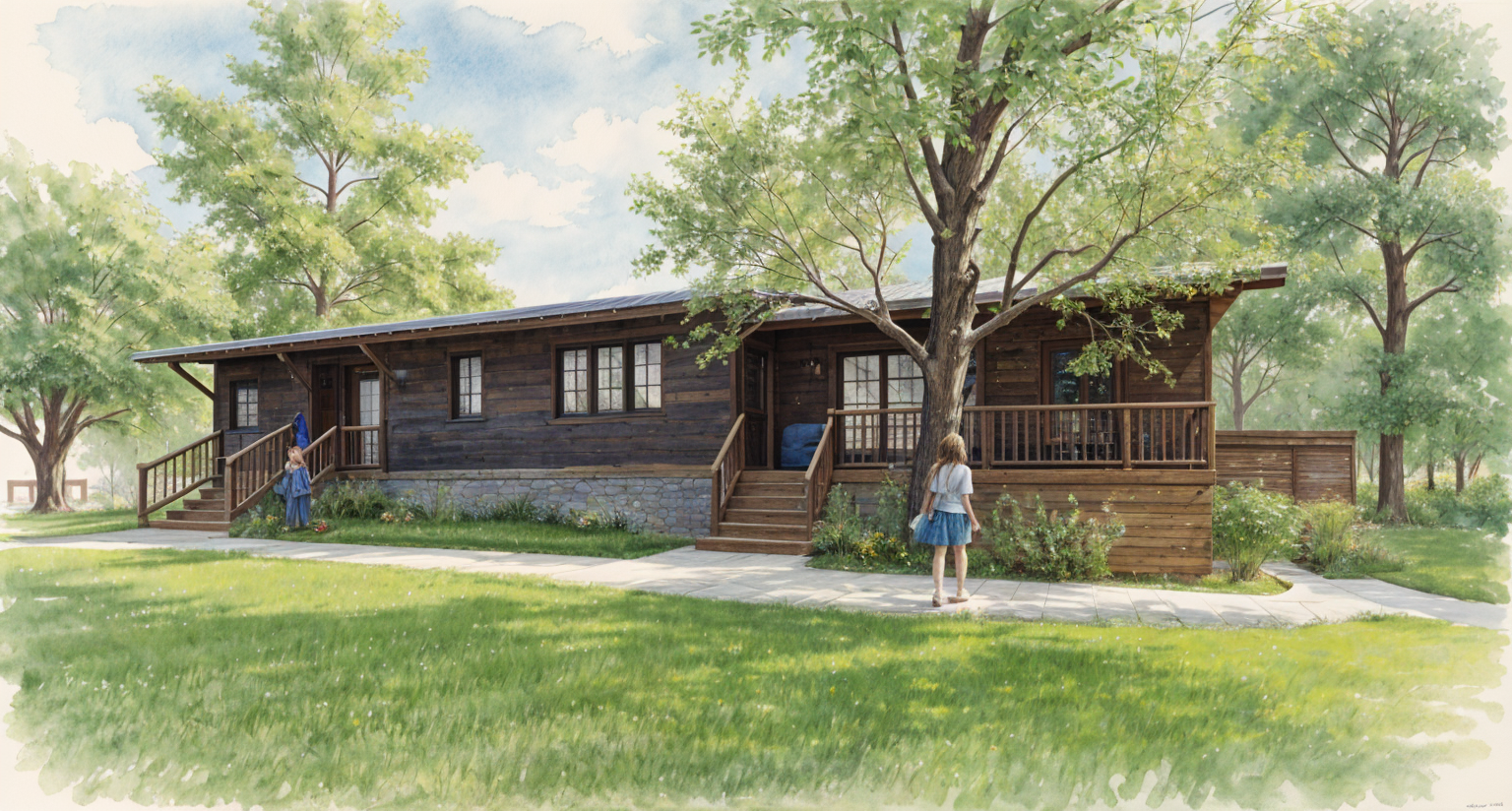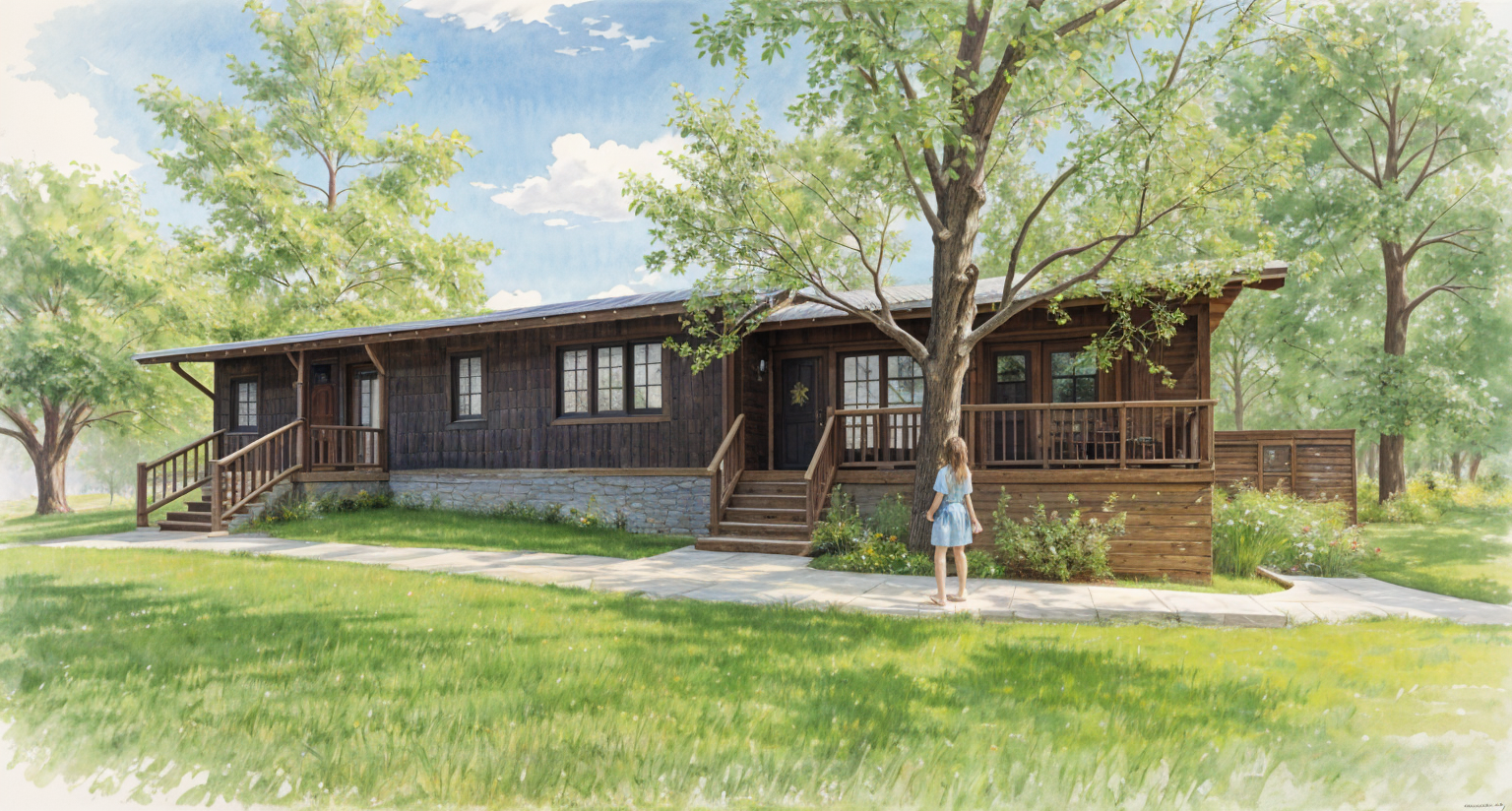 remove red color around windows add clouds to sky this facade should be lit by sunlight render style should be watercolor rendering with sketched outlines remove scale figure on the left by the stairs all would should have a warm gray tone