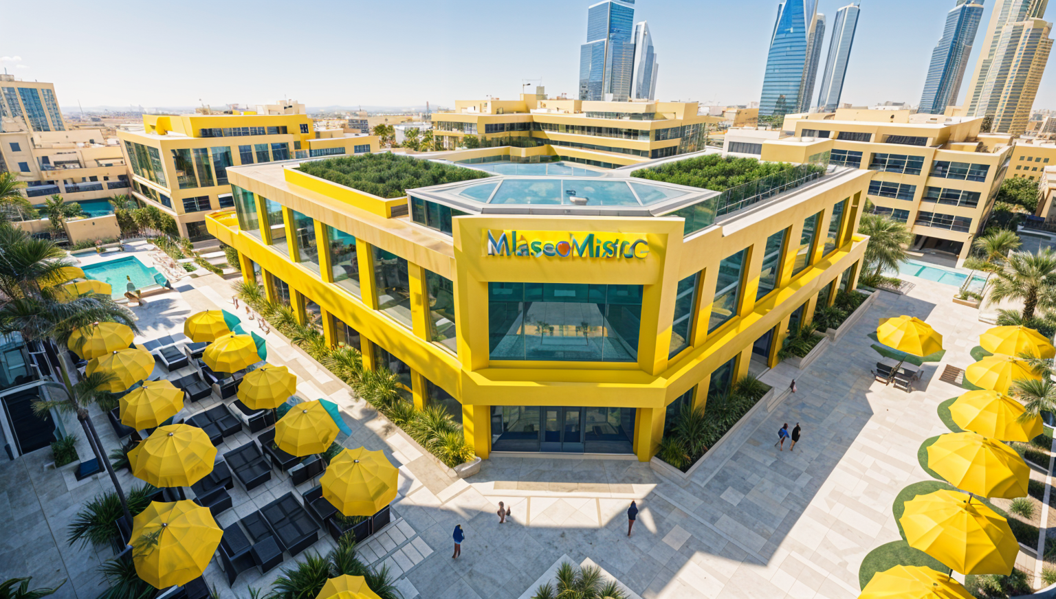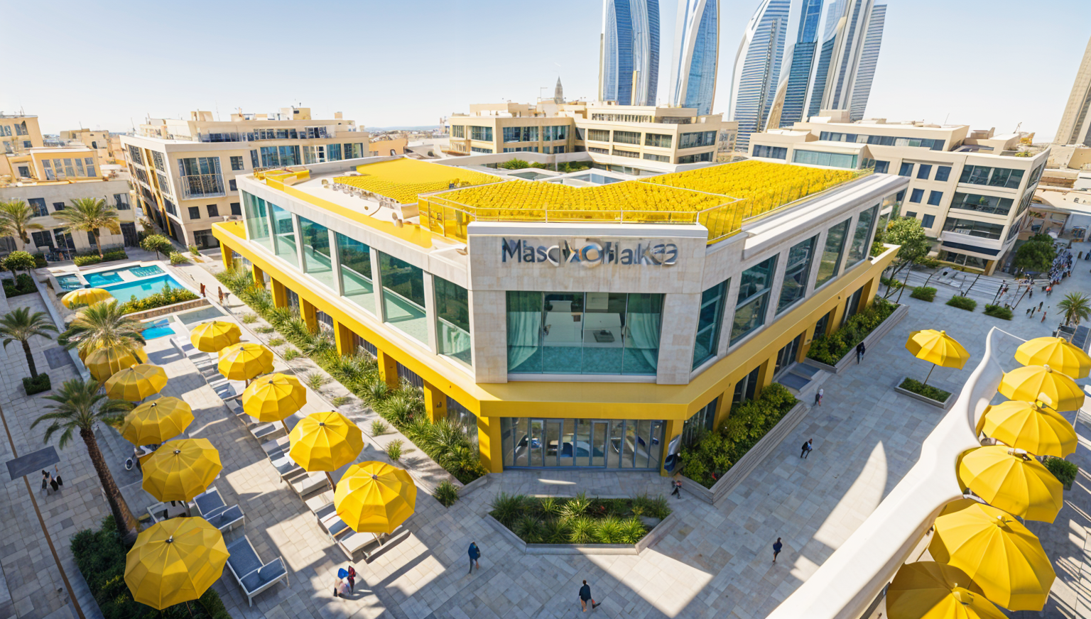 outdoor shoping ceneter dubai sandstone modern facade teraced green roof and solar panels architecture