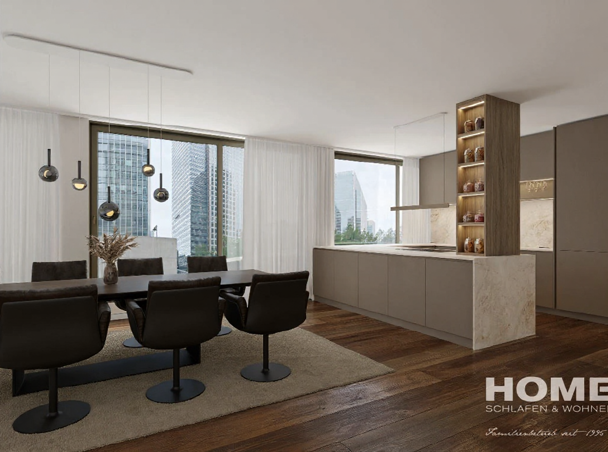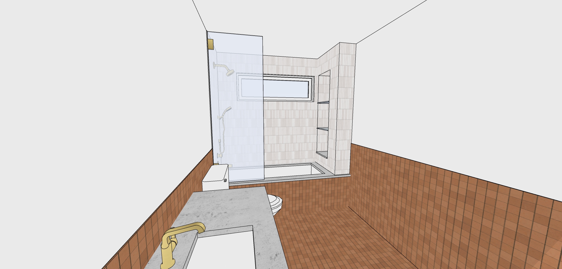 render a photorealistic 3d image of this bathroom with matching materials using brass hardware and a glass shower partition