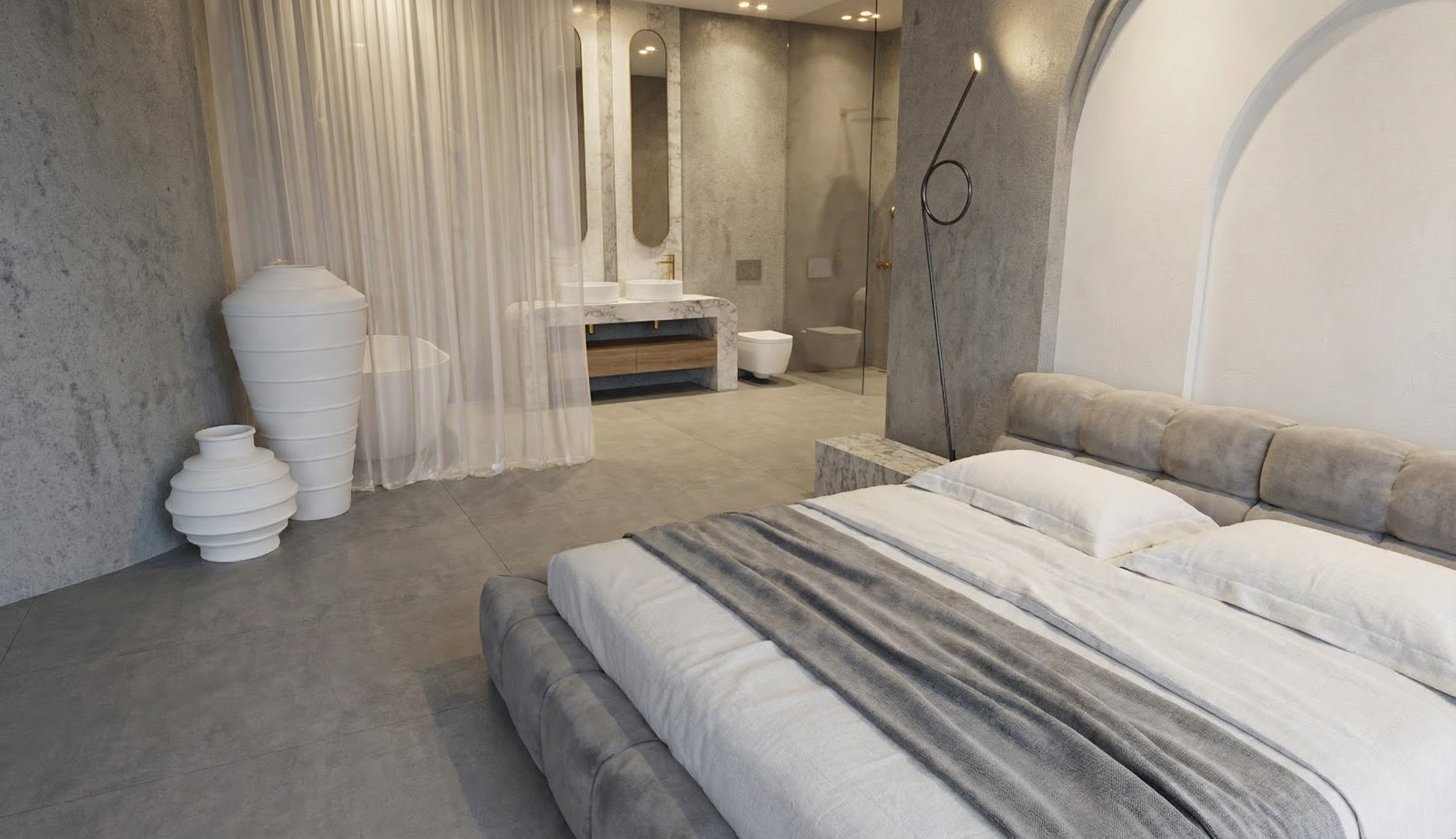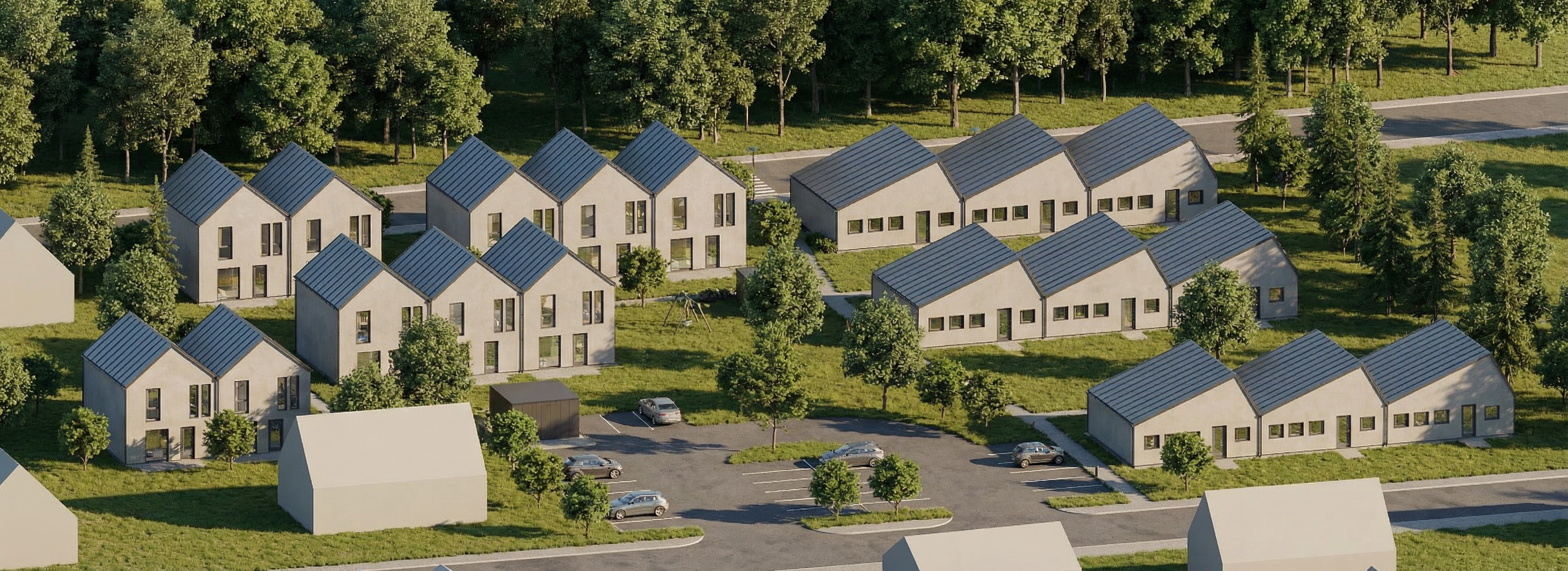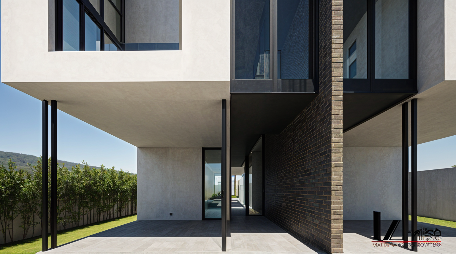 modern minimalist house with a sleek white facade the upper floor has a softly warm gray structured striped plaster large wood windows with grey outdoor blinds the foreground features a lush vibrant green lawn bordered by a variety of colorful plants enrich the atmosphere with blooming pink hydrangeas and soft purple flowers include elegant outdoor furniture on the porch in muted grey tones create a serene ambiance with a clouded sky and a backdrop of distant trees in soft green hues in backgound erase house and coloumn and insert a few trees make the scen more realistic like a photo make a grass more realistic