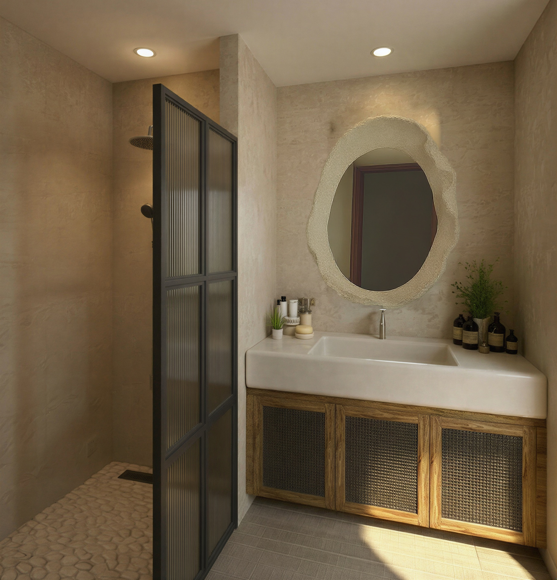 organic shaped mirror in moroccan tadelakt plaster terra cotta irregular contemporary oval curvy