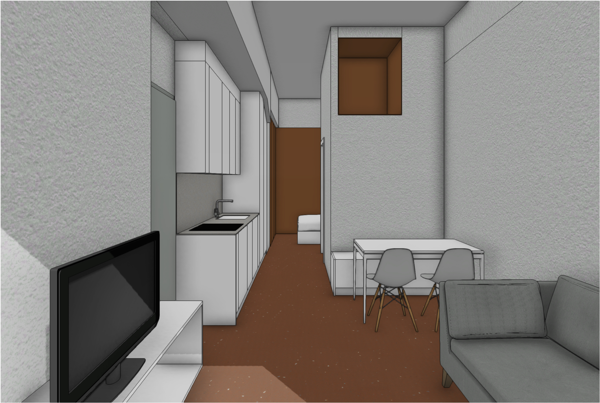 interior shot small apartment white walls and some walls paint in terracotta grey metall main door the floor is pvc terracotta the light is coming from the foreground