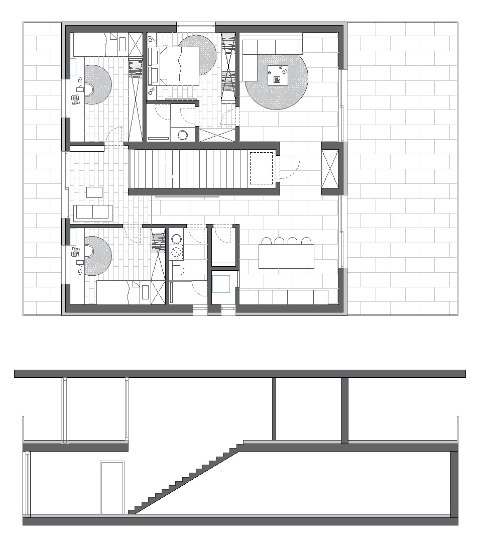 convert this floor plan into a realistic isometric 3d view of a full house show the space from an elevated angle with furniture walls and details visible image type hyper realistic isometric nothing can be changed in the floorplan a modern concrete bushveld lodge bronze aluminium sliding doors and in front of the living room and kitchen a polished concrete floor timber columns on the patio architectural render editorial style with a calm and refined atmosphere camera at eye level neutral lens 35 50mm no distortion main elements and a circular wall feature a dark grey fabric couch critical high fidelity flooring wood herringbone natural wood parquet in herringbone pattern the direction of the pattern must be perpendicular to the wall matte finish soft grain visible no excessive contrast or gloss wall textile finish continuous organic textile surface subtle even texture across the entire wall warm beige brown tone restrained and not overly saturated no visible seams or irregularities aligned with the design language soft neutral architectural interior reflection must feel natural and physically accurate spotlight integrated into the wall vulcano type not turned on fabrics must be refined and cohesive smooth textiles soft patterns no saturated colors no elements the palette couch and chairs dark grey fabric matte soft texture slightly volumetric no lighting soft indirect daylight diffused natural light entering from an unseen source carefully controlled reflections no harsh shadows no overexposure subtle gradients of light enhancing material textures color atmosphere neutral warm palette beige soft browns whites muted blues calm elegant editorial atmosphere avoid strong contrast and avoid color saturation style high end editorial interior photography minimal refined poetic inspired by architectural magazines and big art paintings abstract focus on materiality and texture quality ultra realistic high resolution physically accurate materials pbr soft global illumination no noise no artifacts restrictions do not introduce new elements do not exaggerate textures do not oversaturate colors avoid strong shadows or artificial lighting effects flooring like drawn on the terrace tiles and glas railings arround parquet light color tiny grey tone in wood use the same furniture as shows on the plan do not change the orientation of the floorplan