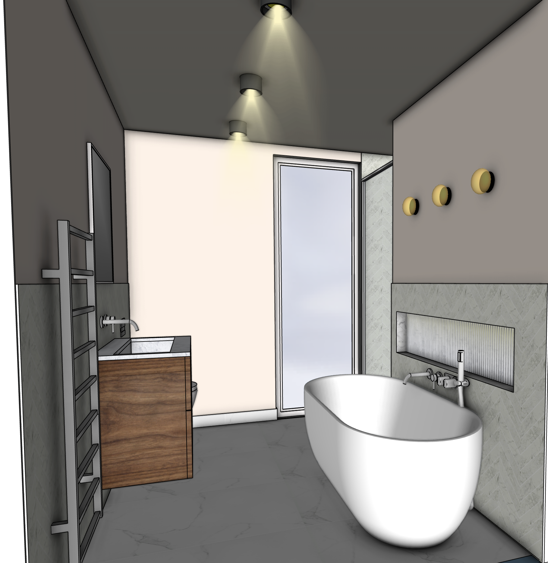 serene shower room with natural materials and muted colours palette loads of natural light coming in from the far window