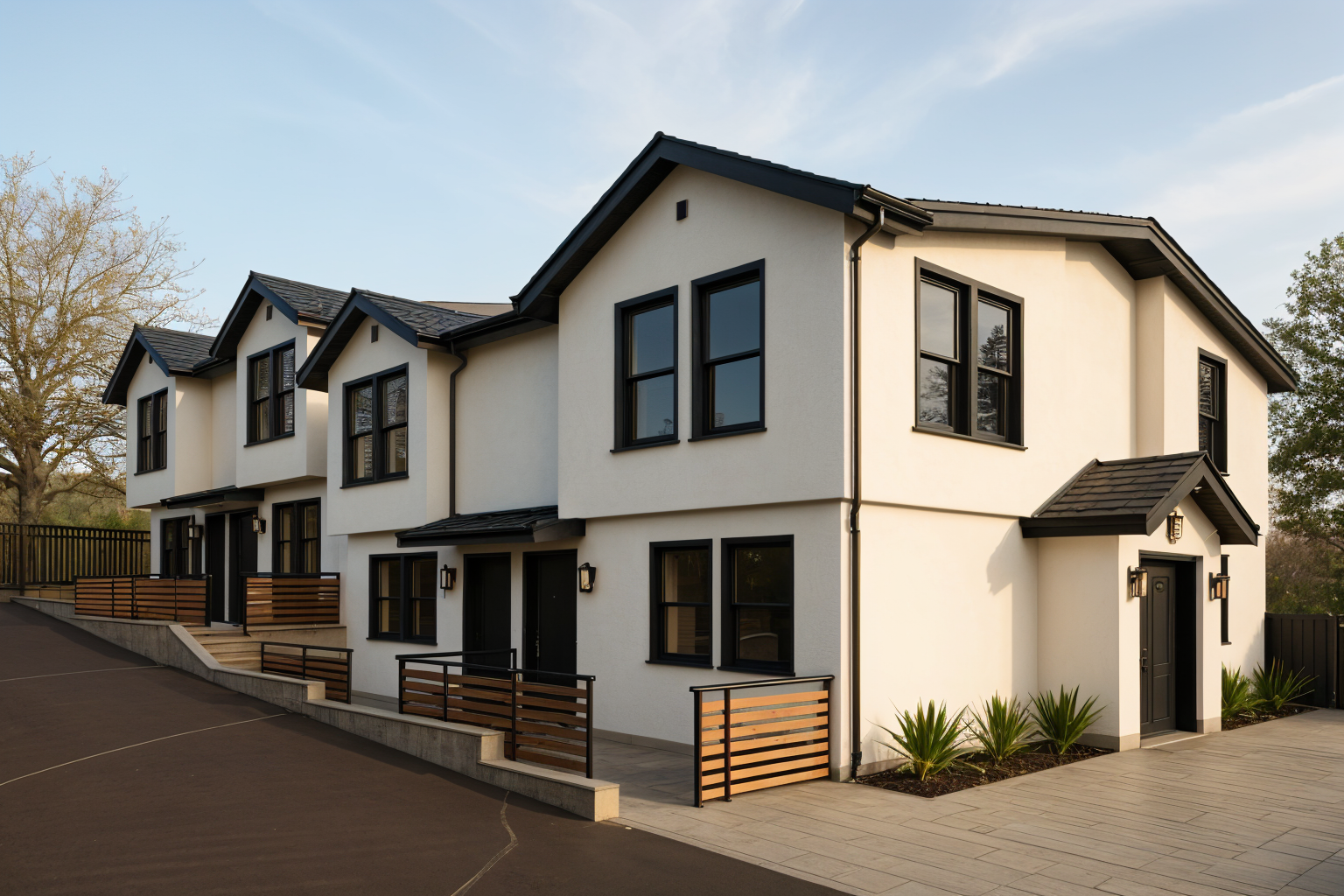 white stucco exterior black windows trim black fascia black gutters black door metal awnings wood and metal railings grass in foreground concrete driveway partly cloudy background asphalt shingle roofing