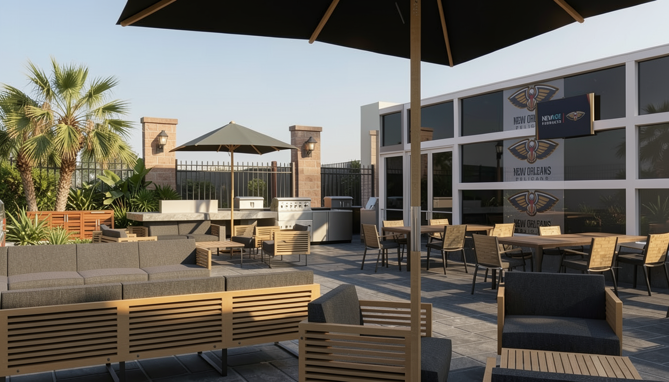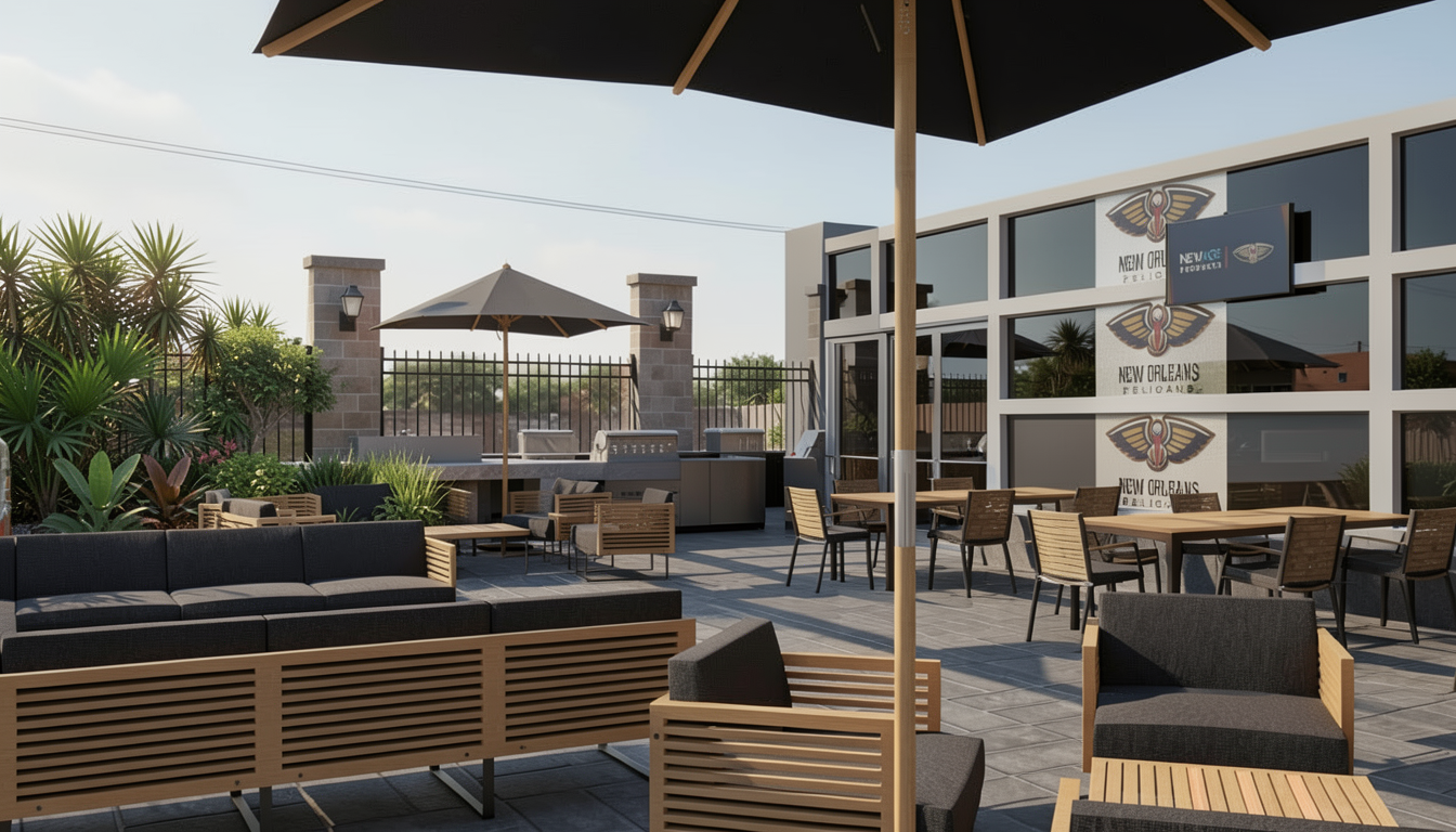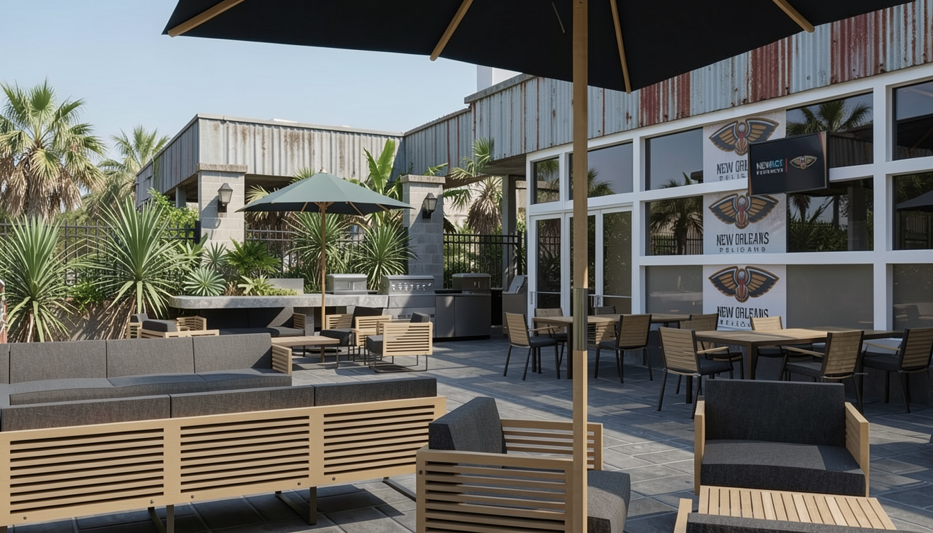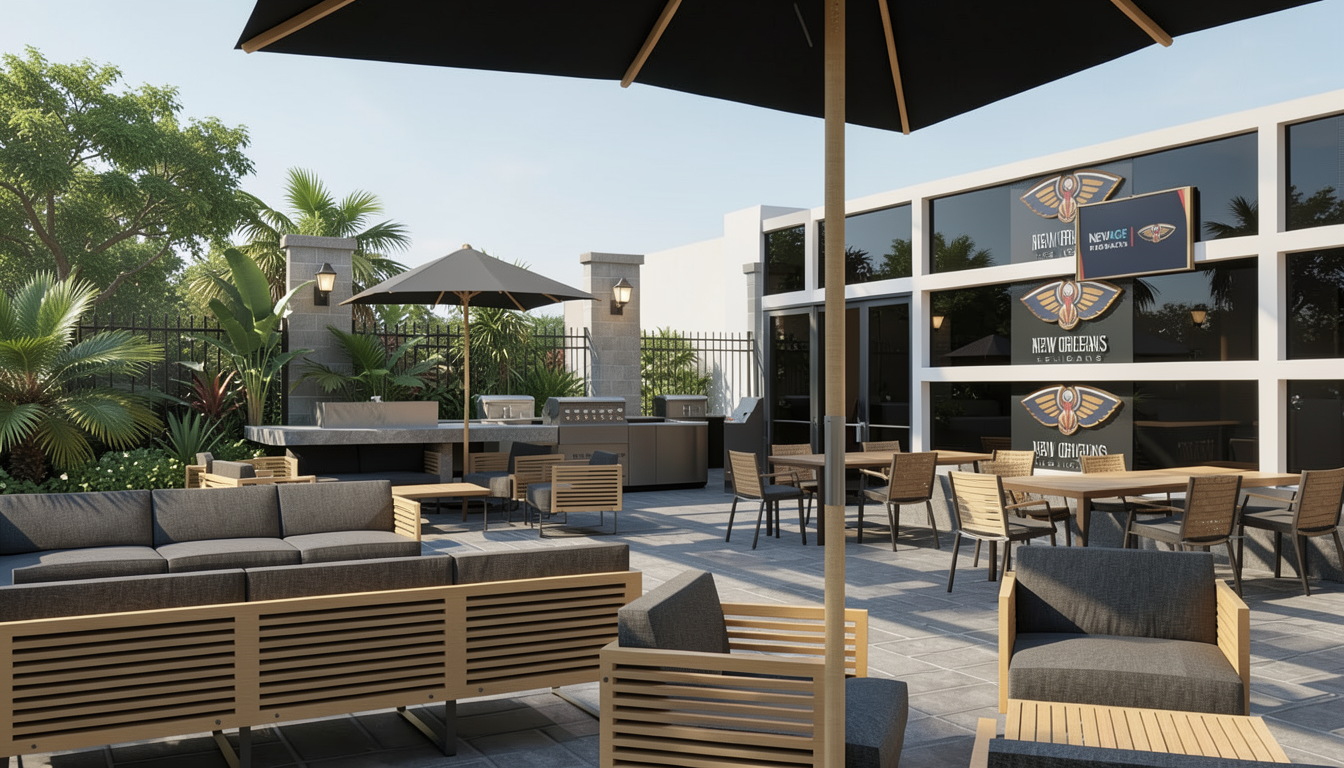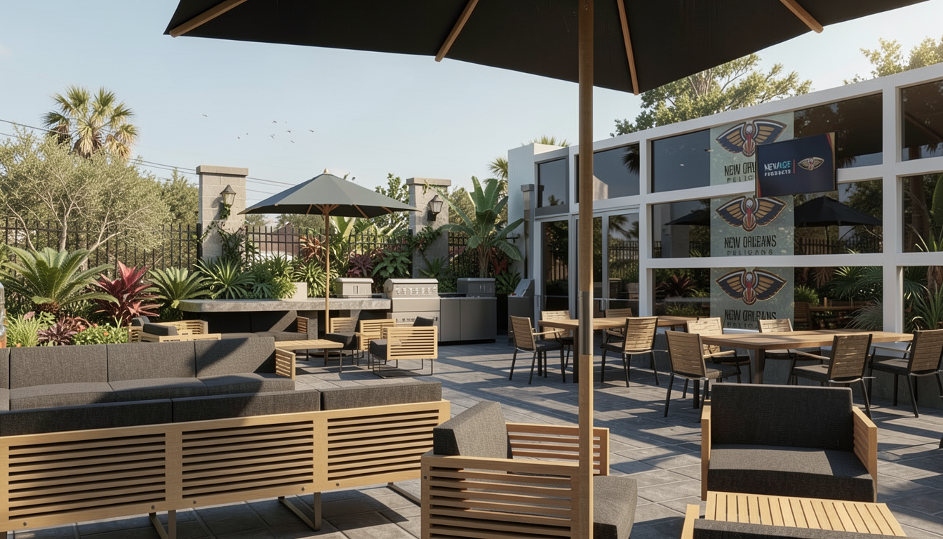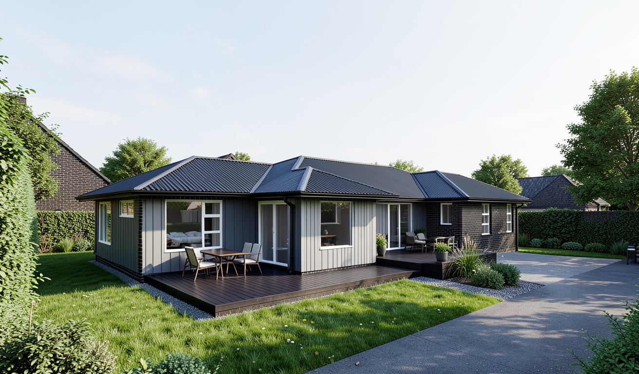 make this photo realistic and add modern simplistic green garden its a small town section it has black bricks with black mortar dark grey vertical james hardie stria cladding black corrugate roofing white windows stained dark deck add some outdoor furniture add a driveway leading up to the far away bedroom window ensure green mowed grass all infront of the deck