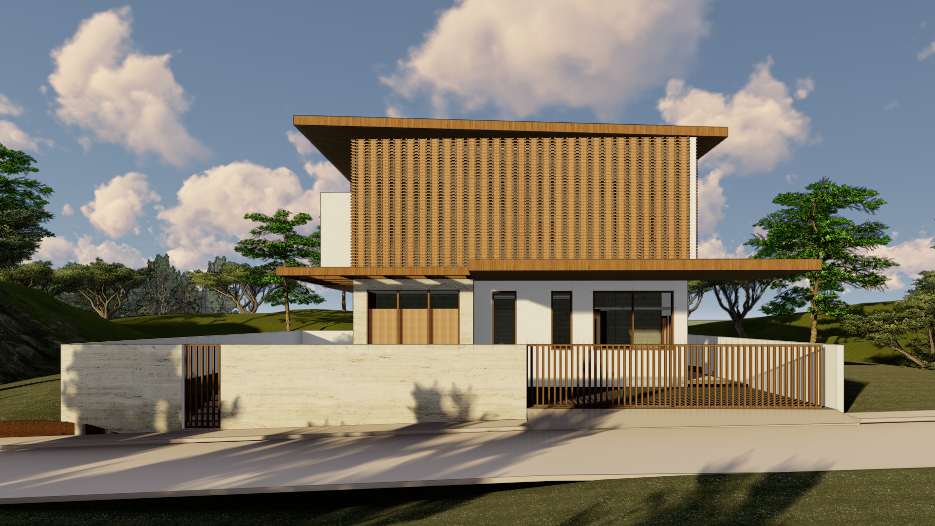 explore replacing the brick type cladding on the second floor mass with thin and densely spaced vertical wood slats and render in night or sunset mode where the slats will feel like a lantern when illuminated from within