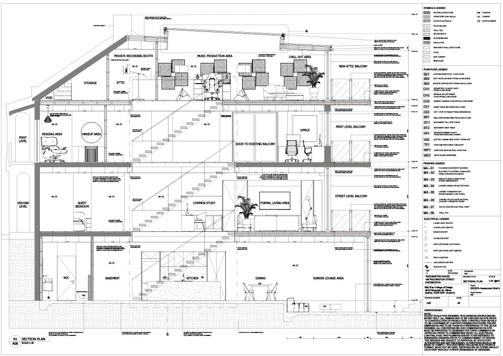 basement level with polished concrete floor minimalist open kitchen with marble island bench dining area with pendant lighting sunken lounge facing landscaped courtyard full height glass sliding doors opening to garden indoor outdoor connection subtle reflections on glass and polished floor