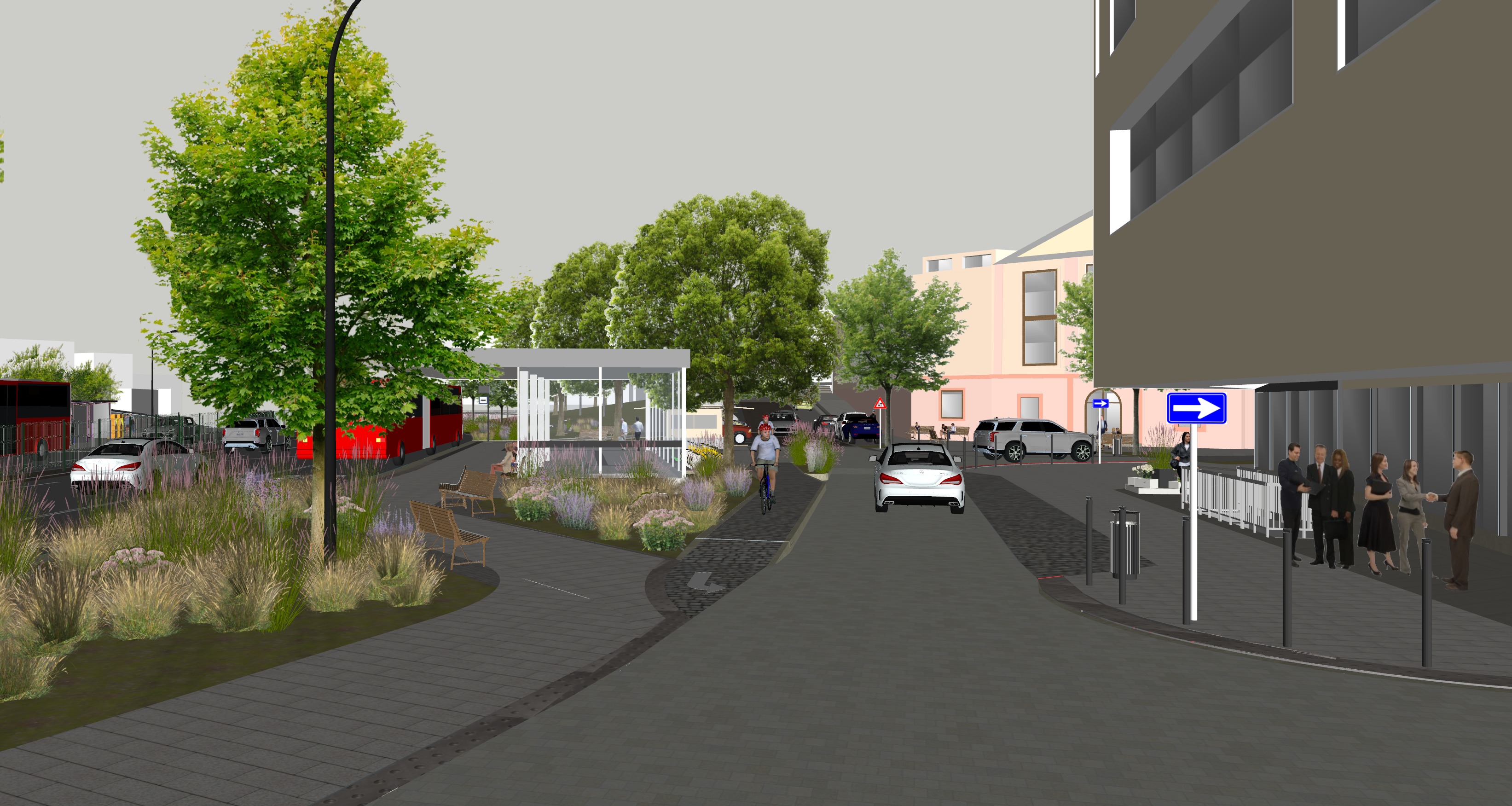 ultra realistic architectural visualization based strictly on the provided raw sketchup view preserve exact geometry proportions camera angle composition and architectural details do not redesign or alter the building enhance only with realism add realistic materials with physically accurate textures natural wood grain brushed concrete glass reflections subtle imperfections micro surface details use high dynamic range lighting with soft global illumination and realistic shadows create a lively atmosphere add naturally positioned people interacting casually walking talking using phones subtle motion blur on some figures for realism include small groups rather than posed characters add a few animals appropriate to the setting e g dog on a leash birds in the sky avoid people and dogs in the middle of the road enhance environment with greenery slight wind in trees varied vegetation tones small urban details parked cars benches subtle signage add depth with atmospheric perspective and realistic sky conditions golden hour soft overcast choose whichever enhances the mood cinematic composition photorealistic rendering 8k detail realistic depth of field natural color grading slightly warm tones architectural photography style shot on full frame camera 35mm lens maintain realism over stylization avoid cartoonish or ai looking artifacts