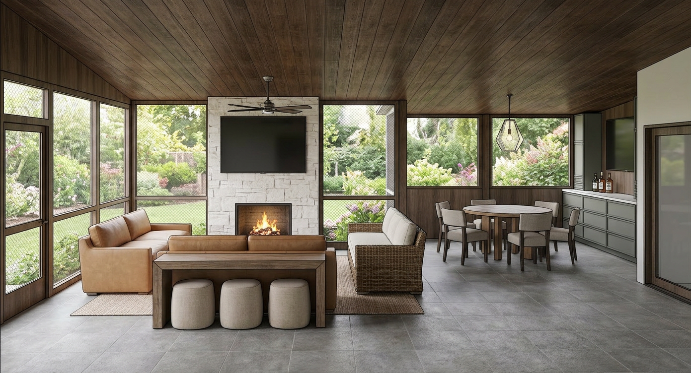 render this screened in porch with natural lighting and backyard scenery through the screens outside add some light styling like some fresh flowers on the table make the table a dark wood the sliding glass door leads into the house