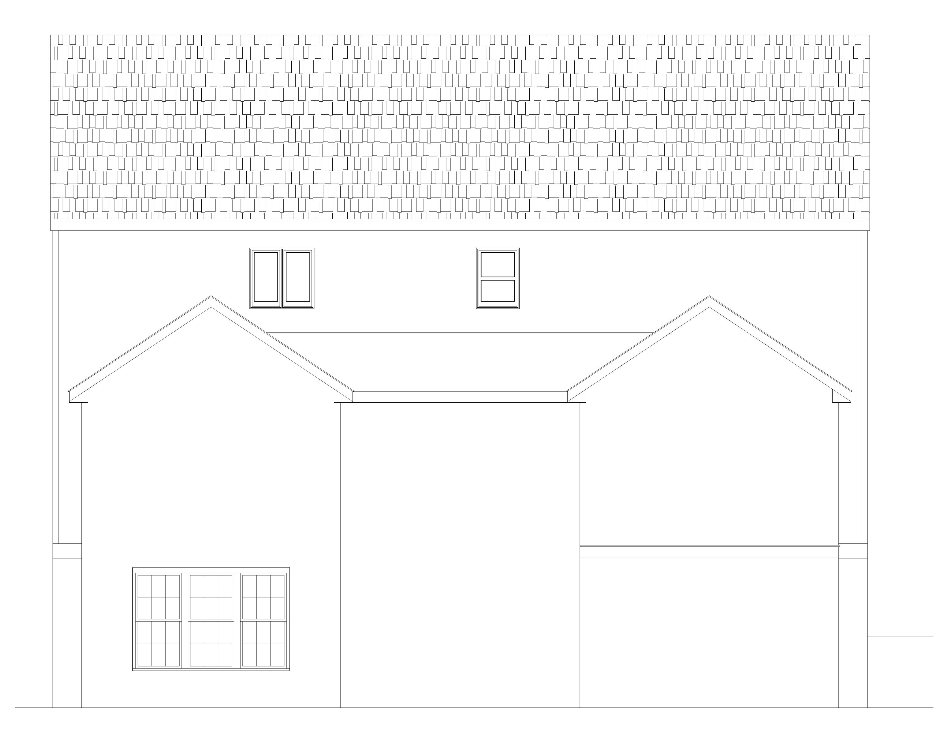generate a beautiful rear elevation rendering of a two story house with a basement with a warm and inviting atmosphere the house features a modern design with a gable roof use soft pastel colors for the walls such as a gentle sage green and white trim for the edges and corners the roof should have a light grey tone with subtle shading to show depth the windows should have white frames and light reflecting glass set the scene during a serene golden hour with a partly cloudy sky casting a peaceful warm light across the house include a well maintained garden in front with lush green grass and colorful flowers like lavender and daisies to enhance the tranquil atmosphere