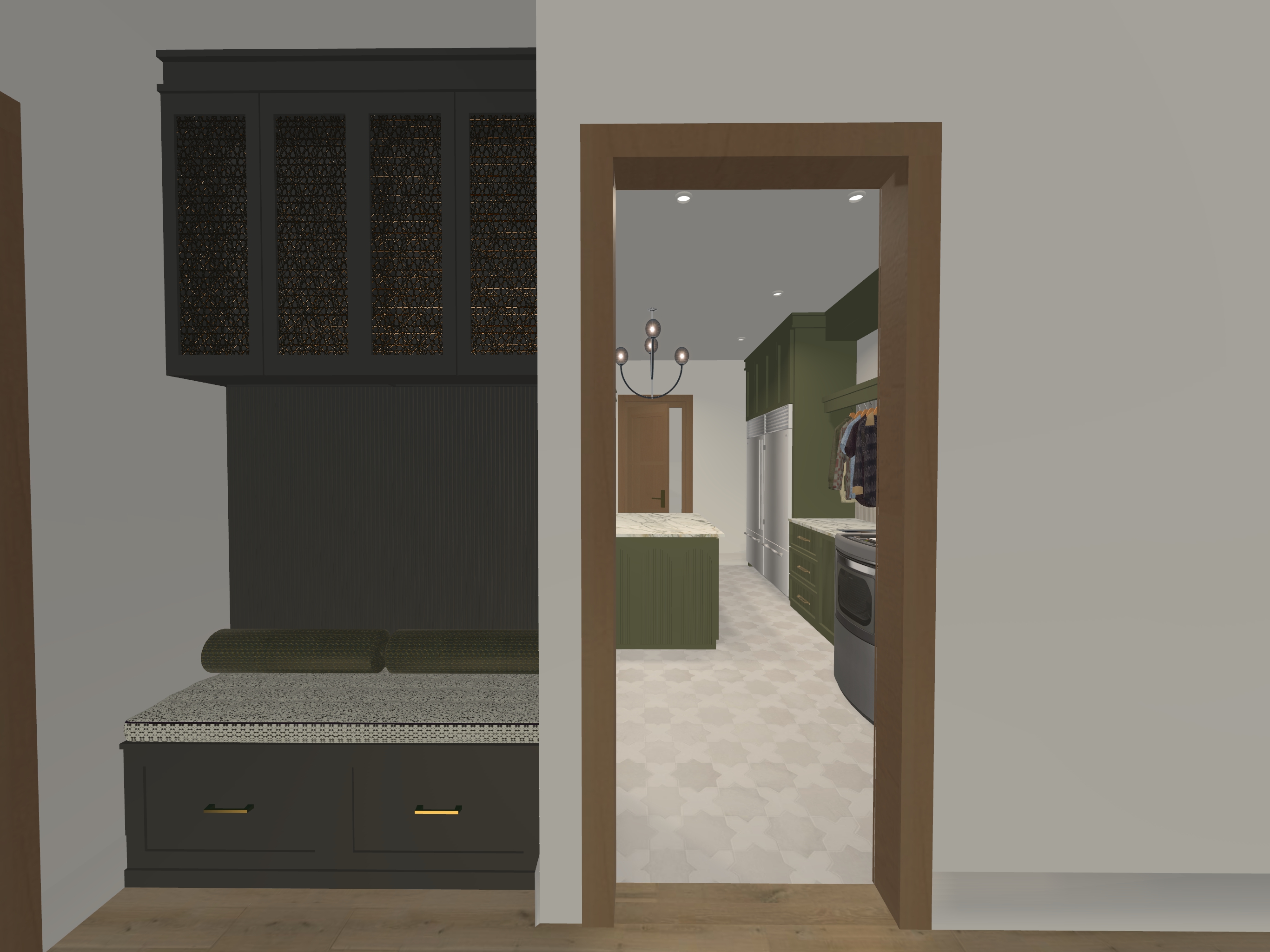 add brass hardware to the cabinets gold mesh in upper cabinets