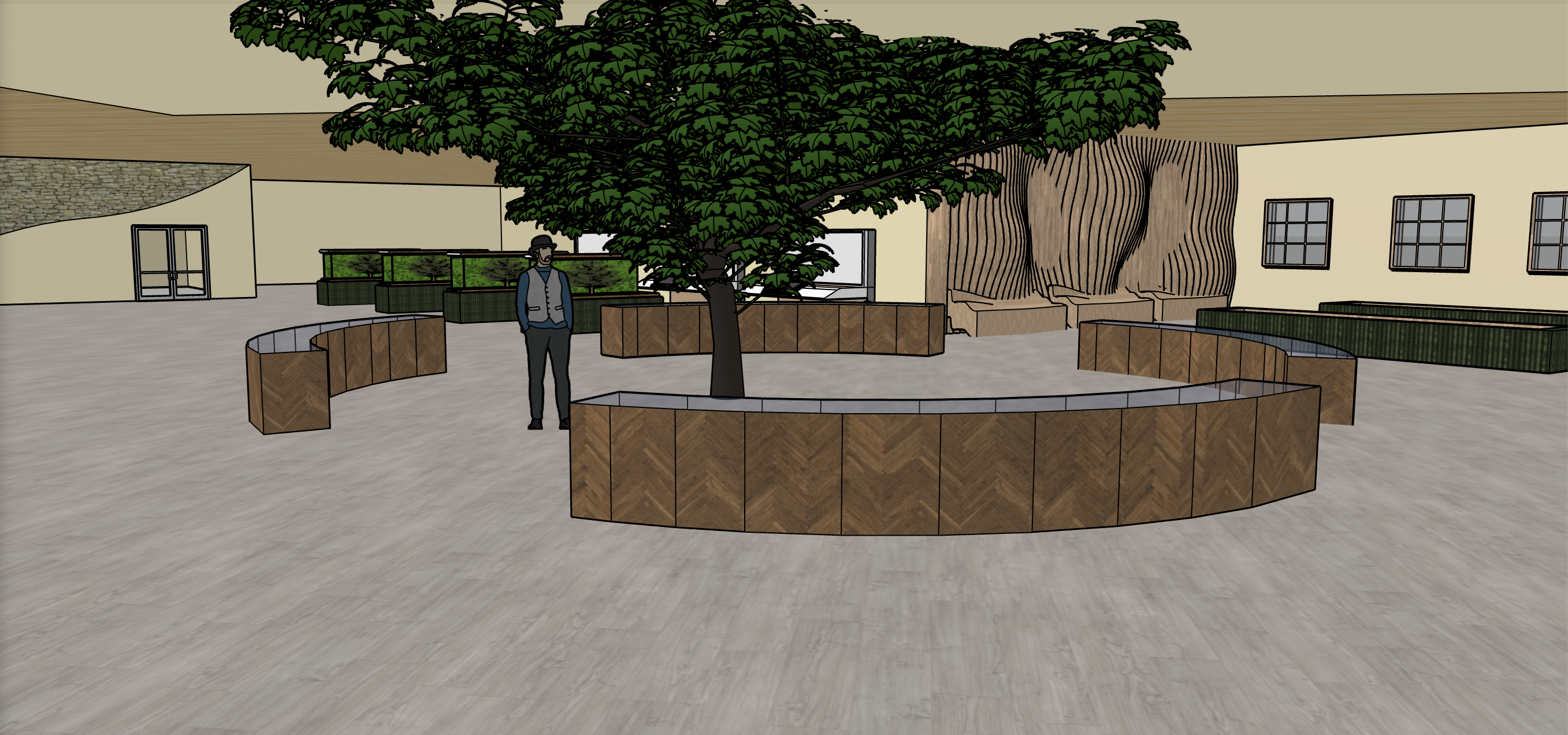 nature museum with a centrepiece tree that has a dirt box aroud it with floor uplights as spotlighting on it ceiling is linear veneer wood planks with integrated downlighting
