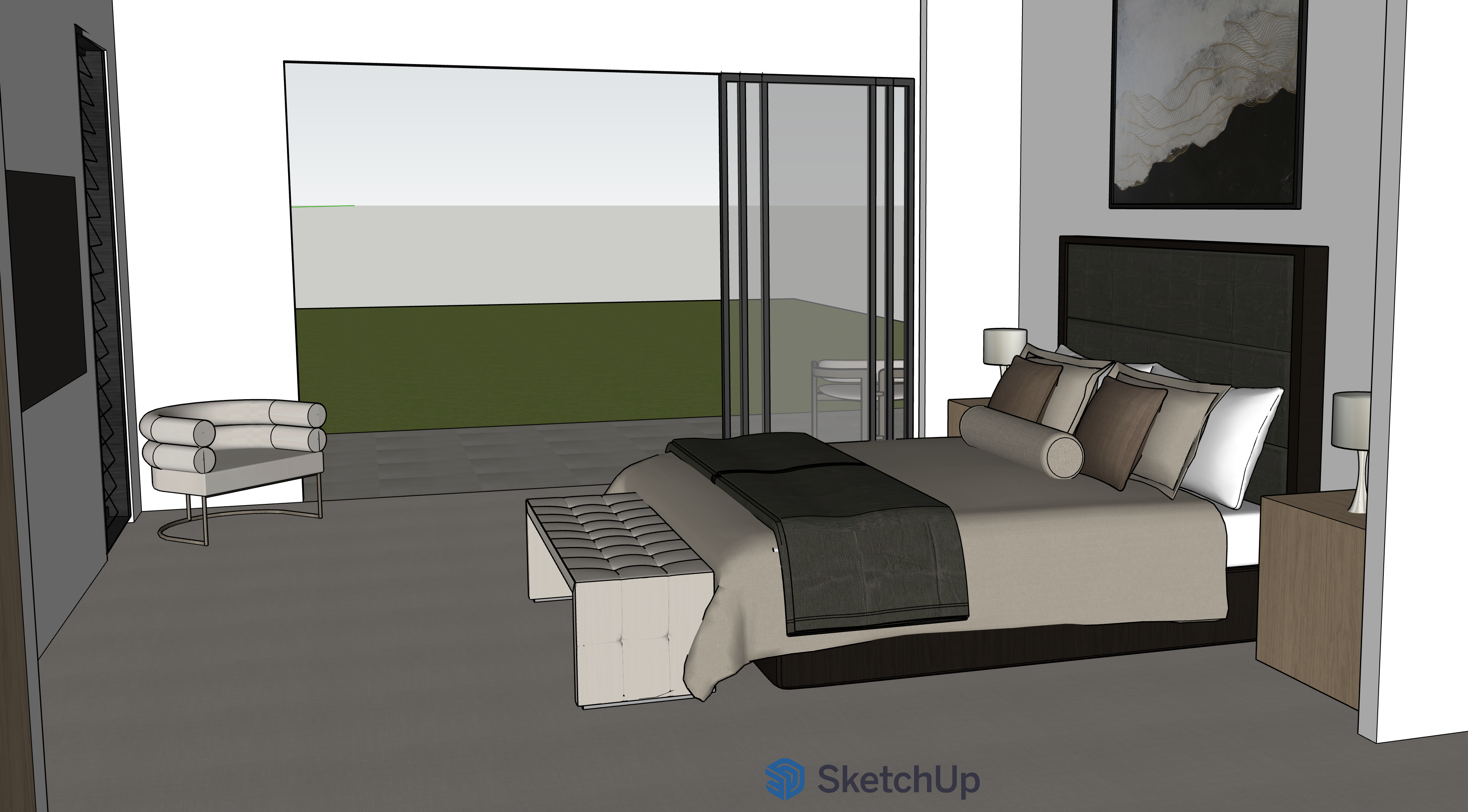 make this photo realistic casita bedroom vibes a modern house on acreage block soft carpet warm tones