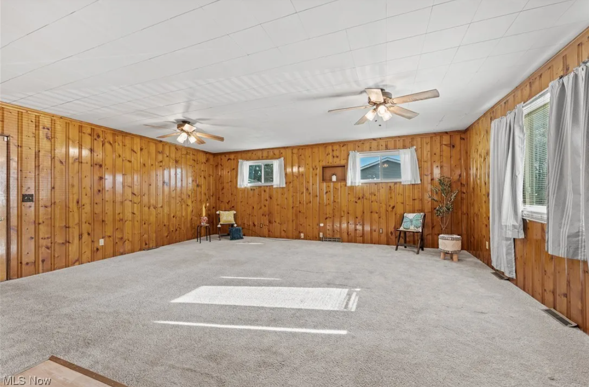 remove the ceiling fans and insert eggshell white drywall over the wood panel walls