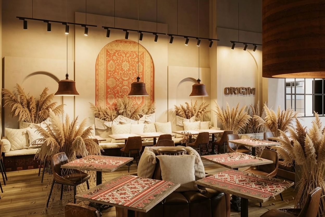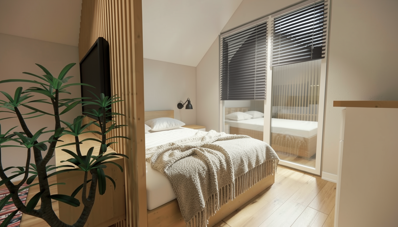 convert this floor plan into a realistic isometric 3d view of a full house show the space from an elevated angle with furniture walls and details visible create a stunning 3d rendering of a modern floor plan featuring an inviting atmosphere use warm earth tones for the floor like oak wood and beige carpeting in the living areas design the kitchen with sleek white countertops and stainless steel appliances for a contemporary look incorporate soft lighting in the dining and living rooms with elegant pendant lights and cozy floor lamps emitting a warm glow paint the walls in soft gray and ivory tones to maintain a calm neutral backdrop contrasting perfectly with lush green indoor plants scattered strategically throughout the rooms enhance the master bedroom with deep relaxing navy and teal accents and plush textured fabrics creating a luxurious yet tranquil retreat add light gray tiles to the bathrooms with subtle metallic fixtures that enhance the serene ambiance ensure the outdoor patio features comfortable seating with charcoal and terracotta cushions surrounded by potted plants in various shades of green creating a harmonious connection with nature perfect for relaxation and social gatherings use the same furniture as shows on the plan do not change the orientation of the floorplan