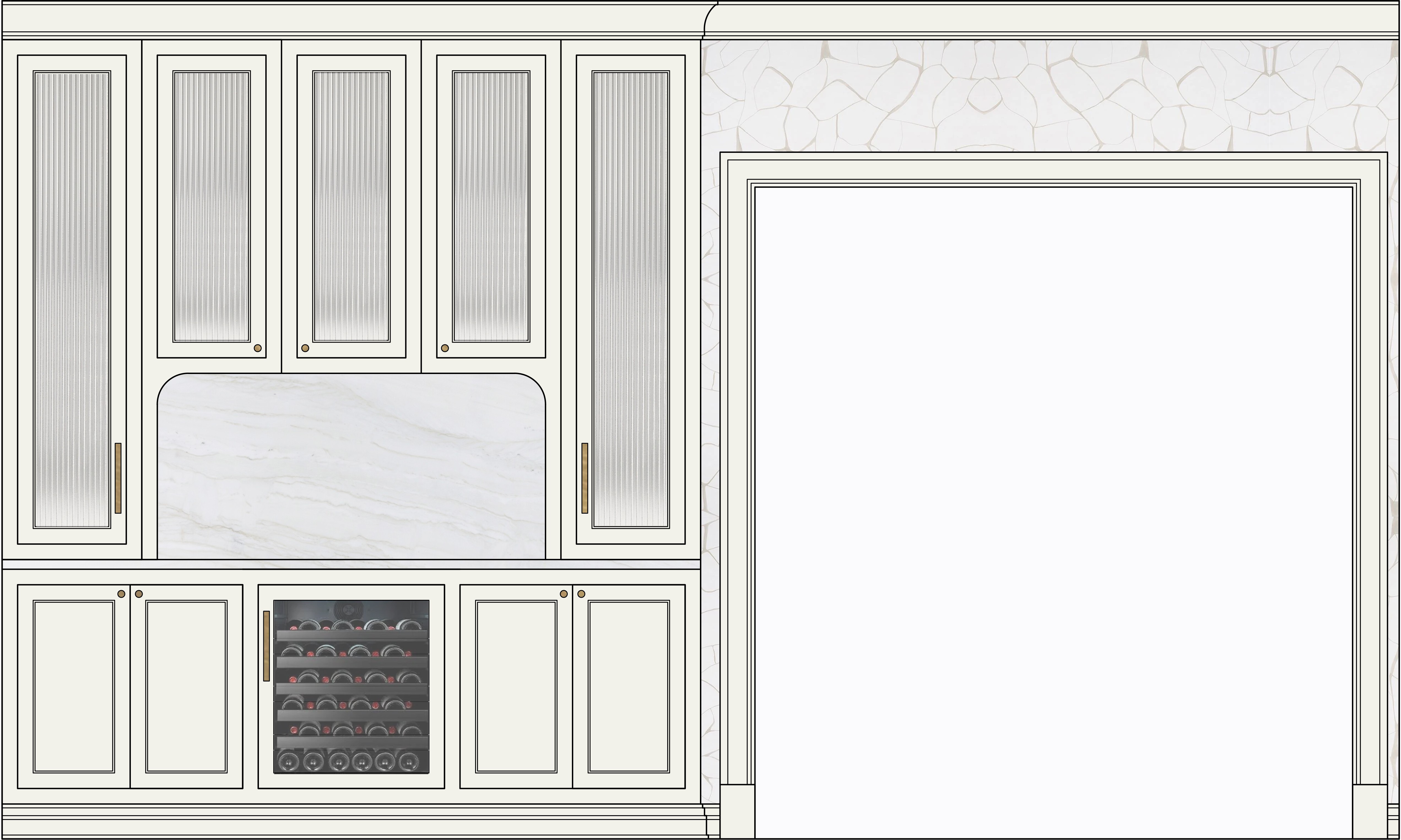 the cabinet hardware is brushed brass the upper cabinets have ribbed glass doors the cabinets crown molding base molding and door trim should be soft white through the large framed opening show an elegant entry foyer show lighting inside the glass cabinets