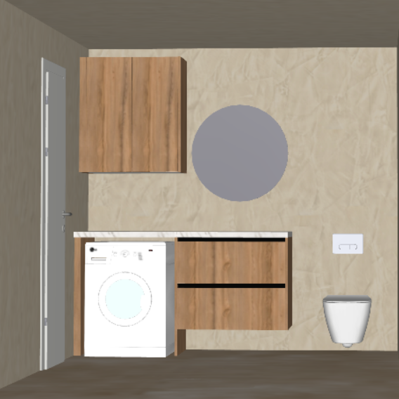 create a beautiful modern bathroom environment focus on warm natural wood for the cabinets adding elegance and texture use soft beige tones for the walls giving a calm inviting atmosphere add a porcelain white sink and toilet for contrast maintaining a clean and fresh look the washing machine should be white with a subtle light blue tint on the door for an innovative modern touch illuminate the space with soft natural lighting to create warmth and comfort the floor should be a slightly darker shade of beige adding depth to the room include a round mirror with a soft gray frame above the sink capture a serene and cozy yet modern ambiance