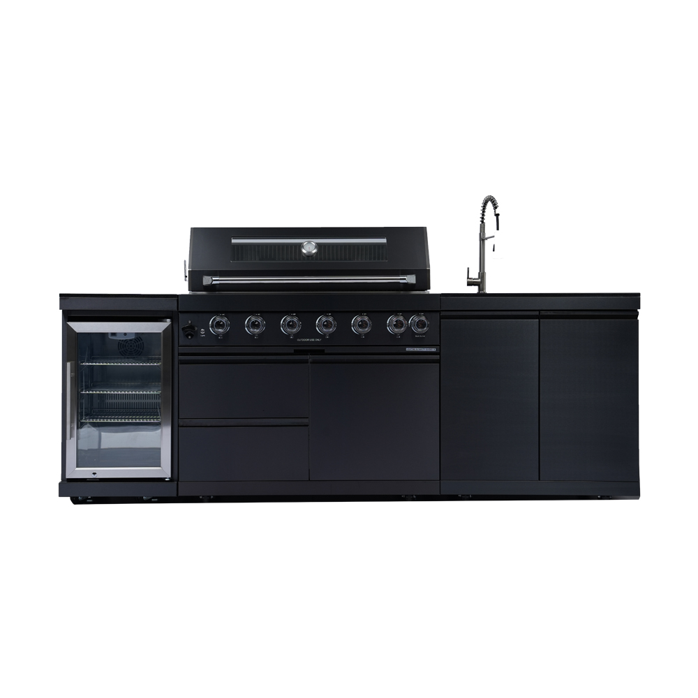 put this outdoor kitchen on a florida lanai with grey pavers and white stucco walls