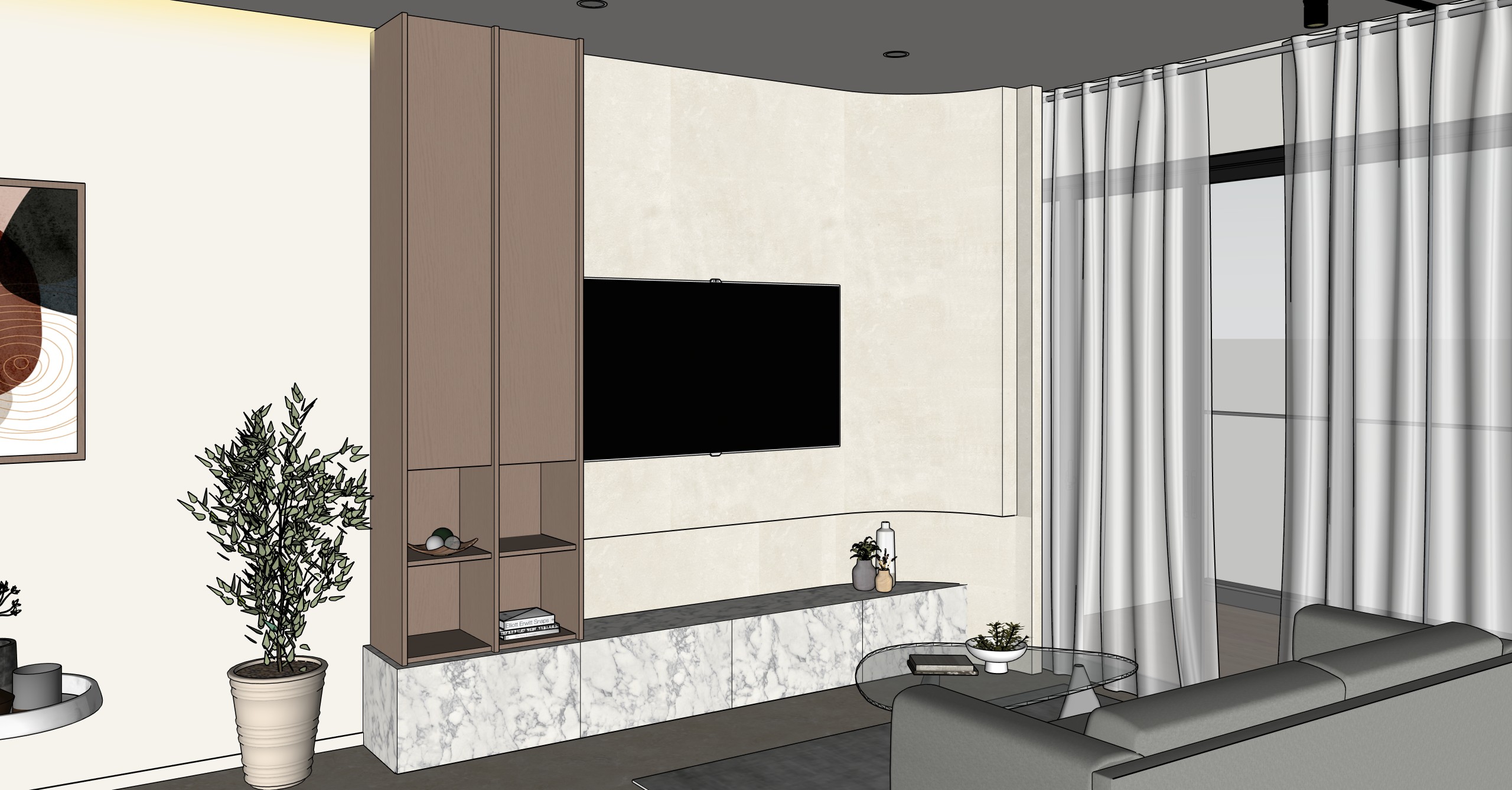 make the wood colour and texture less grains accurate the flooring is beige granite less texture the wood is a cool brown the ceiling is white the wall behind the tv is light beige microcement laminate less texture