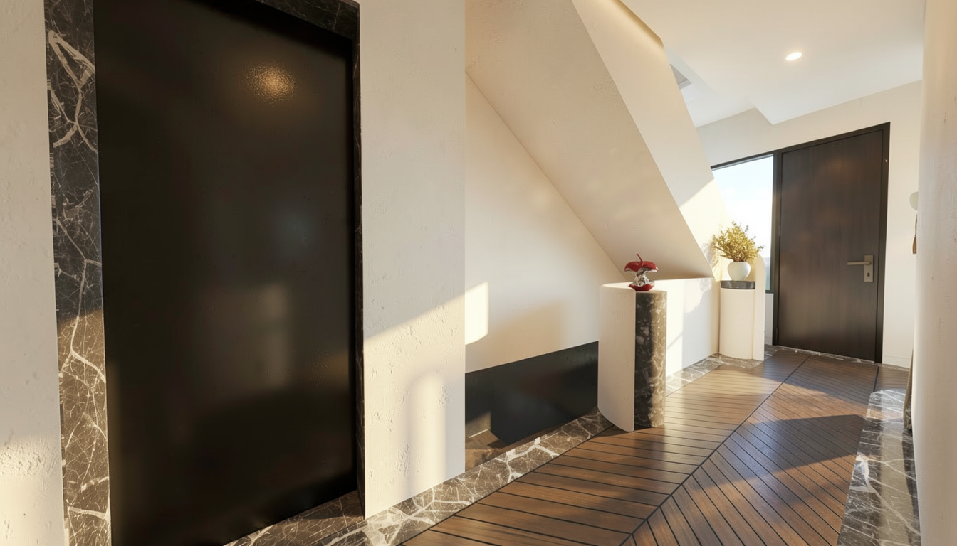 modernist interior shot make it realistic kitchen keep layout cabinets are high gloss white architecture