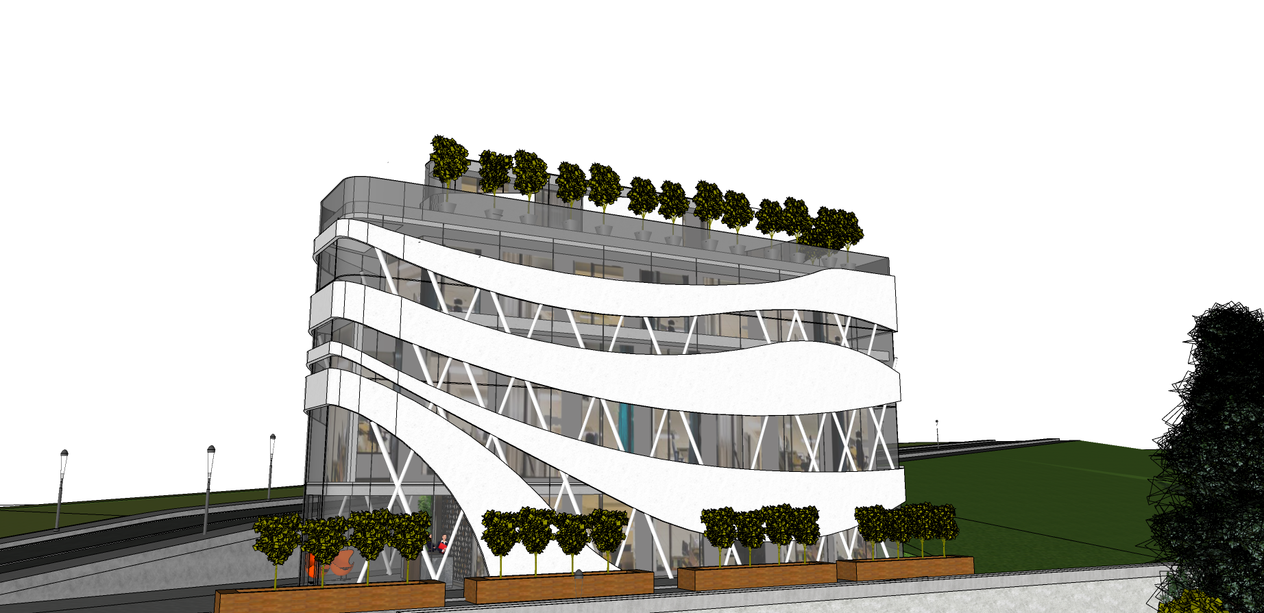 photo of a modern commercial building featuring dynamic white facade elements intertwining with transparent glass the structure emphasizes sleek lines and innovative design with greenery on the roof and planters set in a suburban context near a gentle slope the environment includes well maintained pathways and subtle urban hints the scene is bathed in warm afternoon light creating soft shadows that accentuate the building s contours captured from a low angle the perspective enhances the structure s height and intricacy with a wide angle lens showcasing the expansive surroundings golden hour