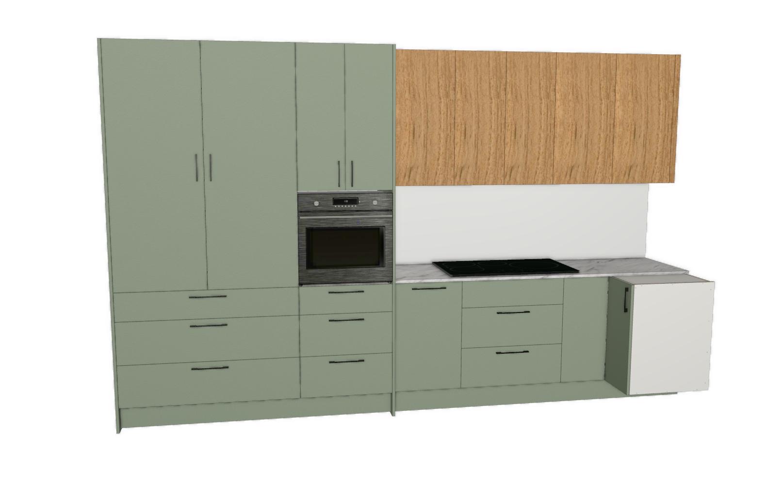 make it look modern and real continue the kitchen to the right there is a sink as the next cabinet add flower and other fancy kitchen machines make the floor timber the green texture on the cabinets is that shade of green with timber grain the timber grain overheads is spotted gum specifically
