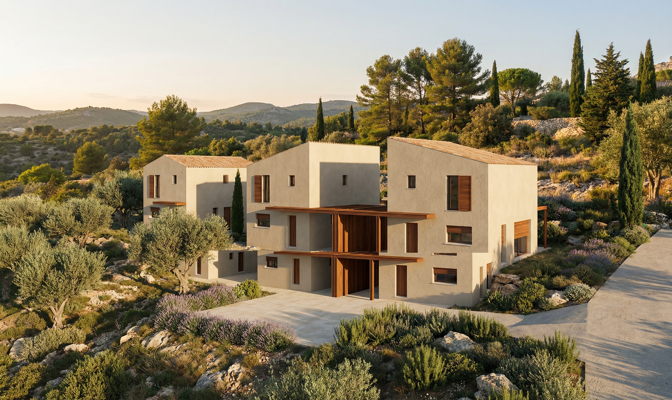 exterior shot i would like to explore how to modernize this building s facade please render the top concrete band of the building have wood cladding and recolor the existing columns to a grey color i would also like to up light the columns to accentuate their forms