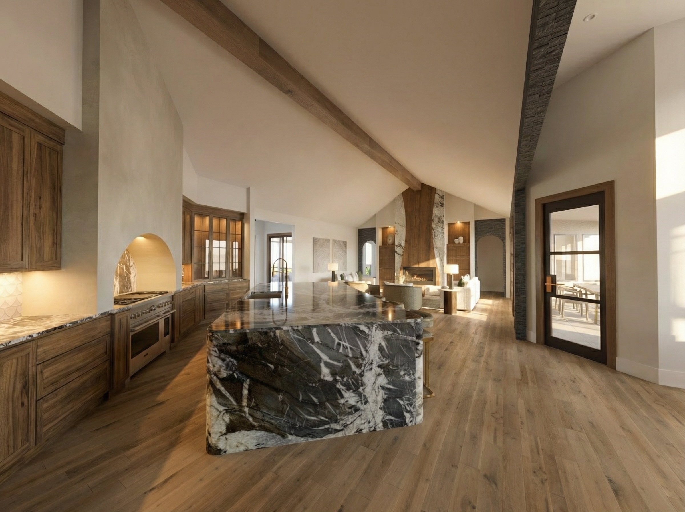 a cozy modern interior design featuring a lively and colorful wall adorned with vibrant geometric patterns in shades of pink orange blue green and purple the upper walls are painted a rich deep plum complemented by sleek dark gray accents stylish pendant lights hang above exuding a soft inviting glow the seating includes elegant dark toned booths with subtle wooden details contrasted by a polished concrete lower wall the atmosphere is warm and welcoming perfect for a trendy urban caf