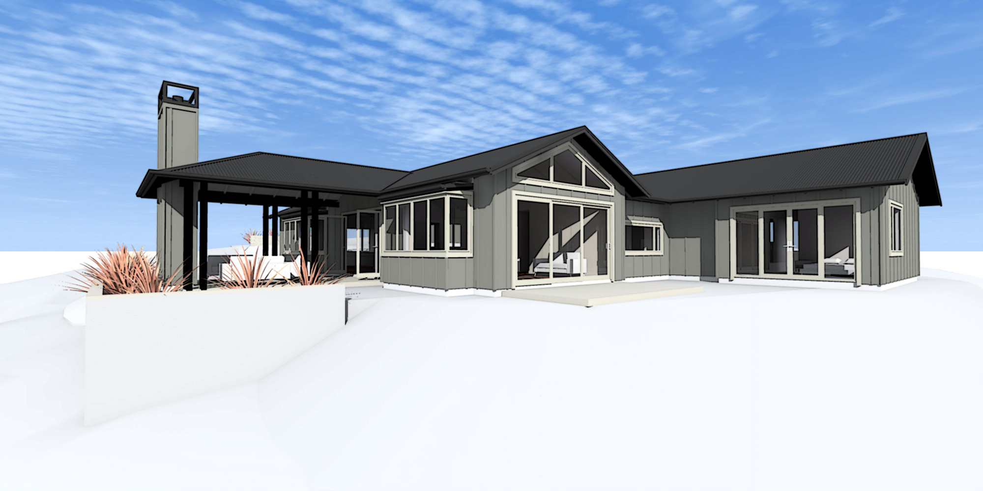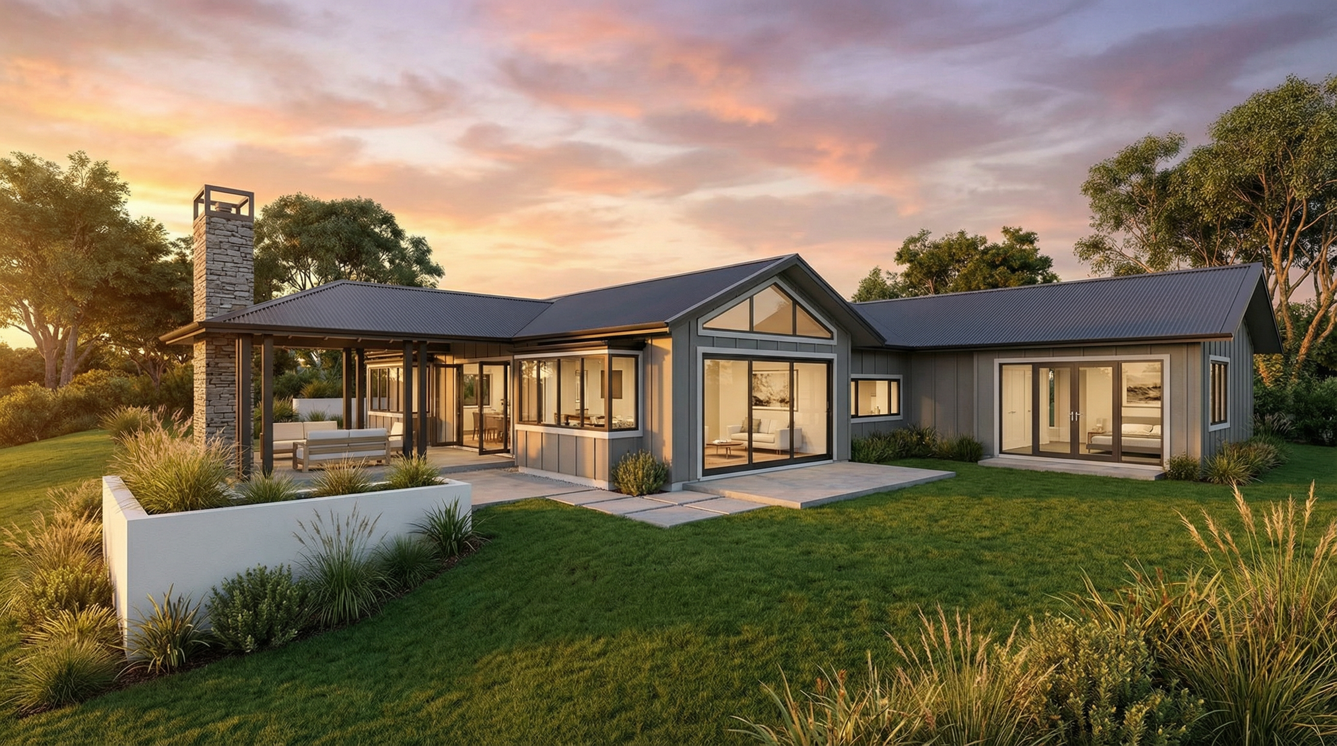 dark cladding dark window joinery dark window facing boards lawns native planting background trees sunset