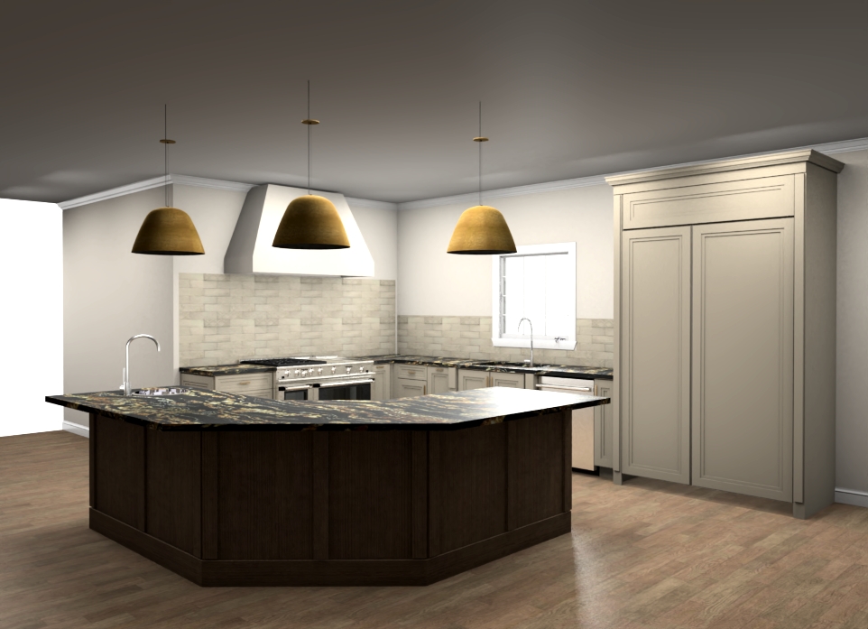 create a hyper realistic image from this kitchen renderings cabinets are accessible beige with a white oak island transitional modern style add two floating shelves on each side of the window natural light with sunlight add two leather counter stools to each section of the island six total stools
