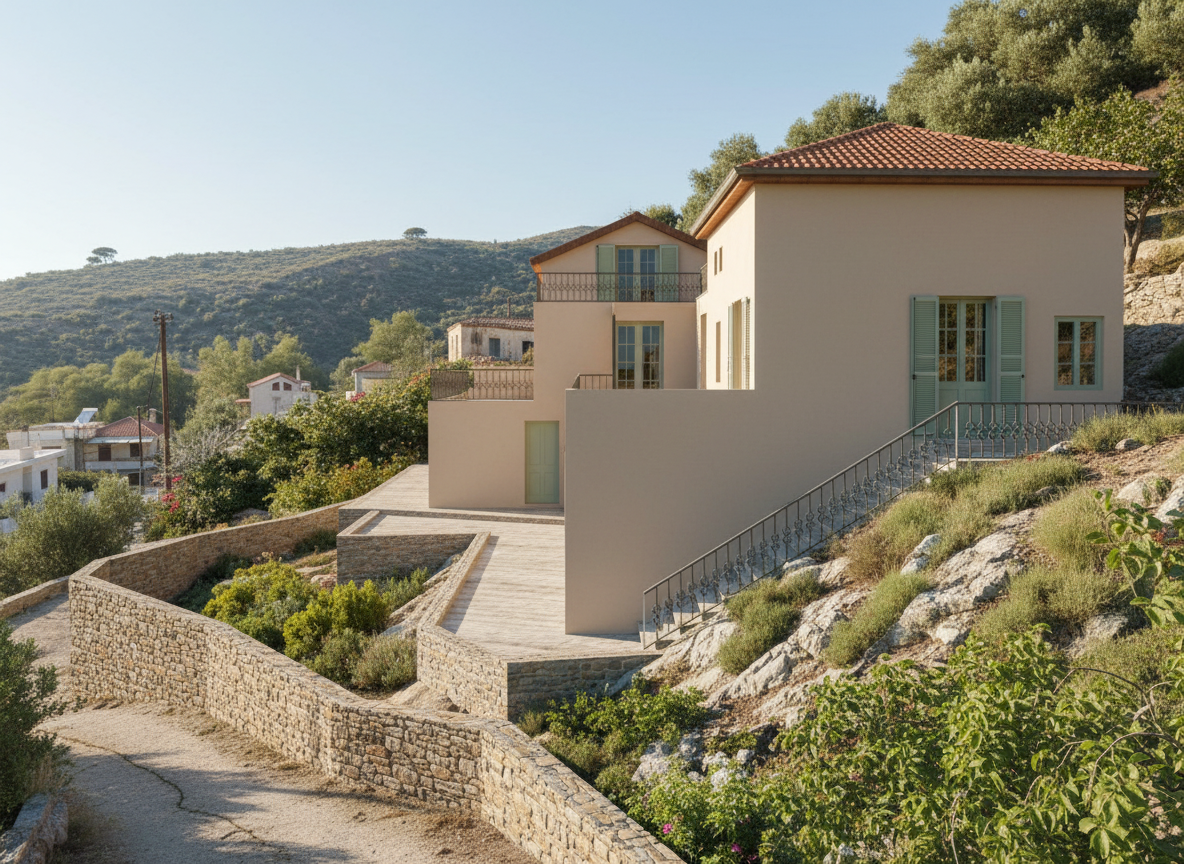 highly realistic architectural rendering of a residential building the facade features white painted brick with subtle texture the canopy is a sleek modern element made of black aluminum the windows have wooden frames finished in white lacquer the terrace is surfaced with big gray natural stone slabs in front of the terrace a flowy landscaped area with grass and low shrubs is visible maintain the existing materials proportions and overall composition of the original design soft natural daylight contemporary architectural style high detail